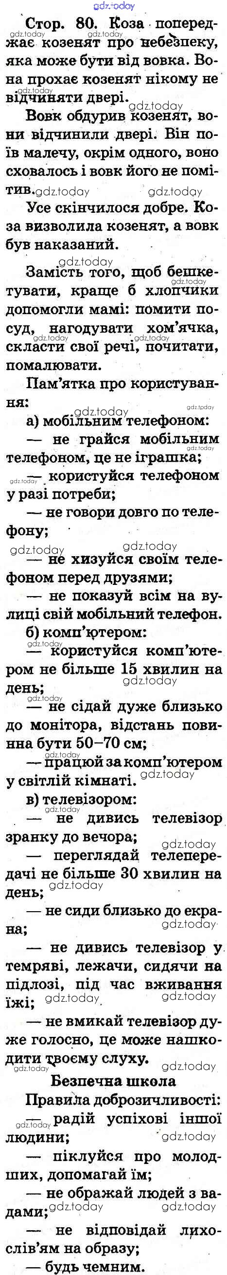 На страницах сайта gdz.today вы найдете учебный и вспомогательный материал, направленный на улучшения знаний школьной программы. ГДЗ - онлайн мир знаний Рішення до Сторінки 80 Учебнику по Основам здоровья для 2 класса Воронцова, Бех Алатон 2012