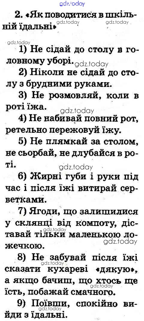На страницах сайта gdz.today вы найдете учебный и вспомогательный материал, направленный на улучшения знаний школьной программы. ГДЗ - онлайн мир знаний Рішення до Як поводитися за столом 2 Учебнику по Основам здоровья для 2 класса Гнатюк Генеза 2012