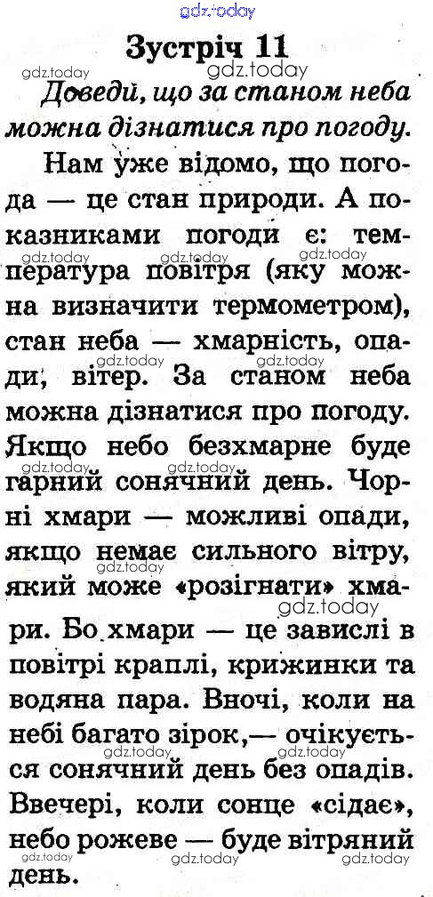 На страницах сайта gdz.today вы найдете учебный и вспомогательный материал, направленный на улучшения знаний школьной программы. ГДЗ - онлайн мир знаний Рішення до Зустрічі 11 Учебнику по Природоведению для 2 класса Грущинская Освiта 2012