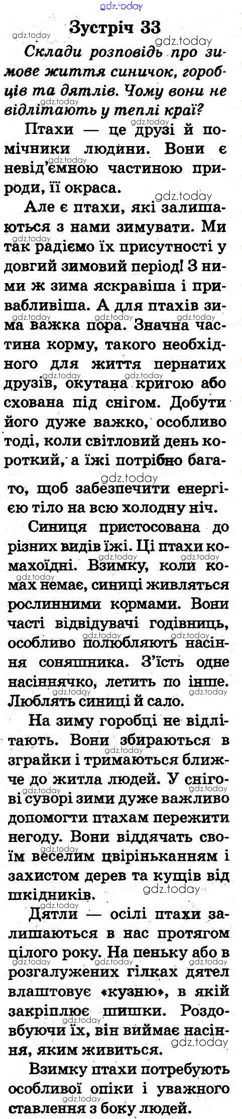 На страницах сайта gdz.today вы найдете учебный и вспомогательный материал, направленный на улучшения знаний школьной программы. ГДЗ - онлайн мир знаний Рішення до Зустрічі 33 Учебнику по Природоведению для 2 класса Грущинская Освiта 2012