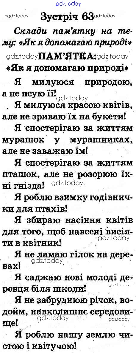 На страницах сайта gdz.today вы найдете учебный и вспомогательный материал, направленный на улучшения знаний школьной программы. ГДЗ - онлайн мир знаний Рішення до Зустрічі 63 Учебнику по Природоведению для 2 класса Грущинская Освiта 2012