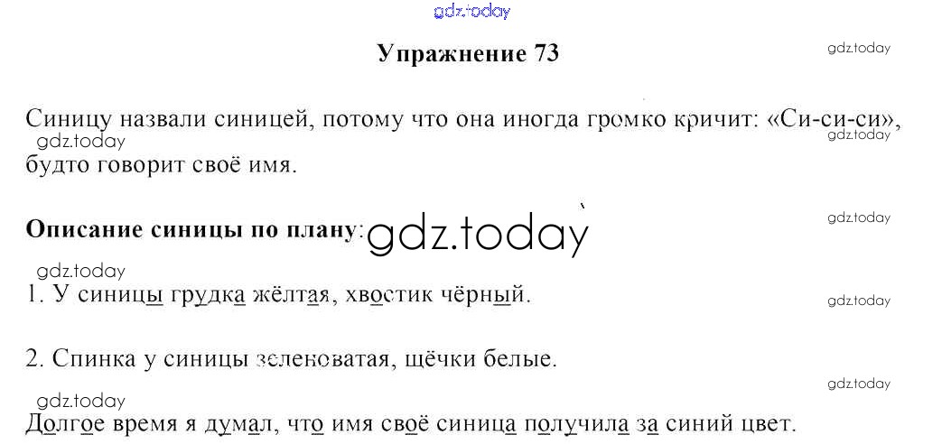 На страницах сайта gdz.today вы найдете учебный и вспомогательный материал, направленный на улучшения знаний школьной программы. ГДЗ - онлайн мир знаний Решение к части 1. Упражнения 73 Учебнику по Русскому языку для 2 класса Антипова, Верниковская Аверсэв 2019