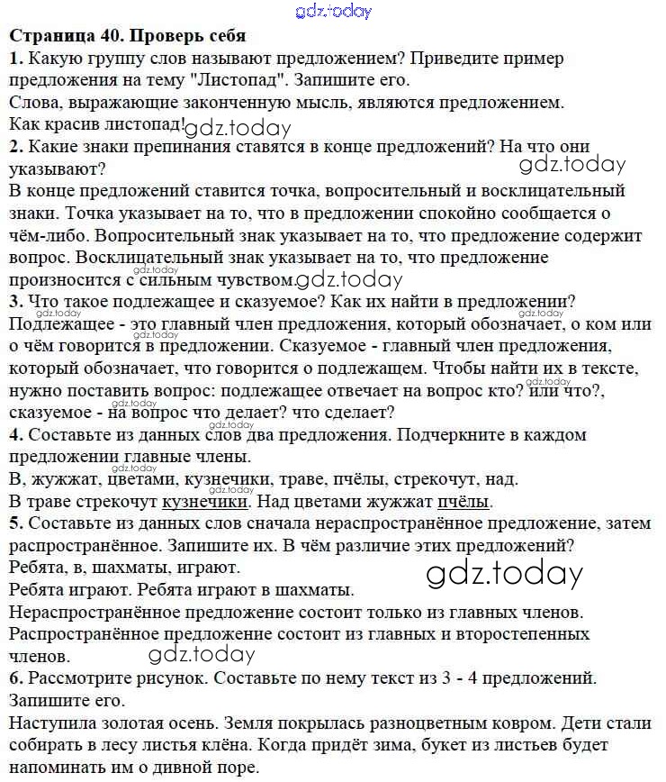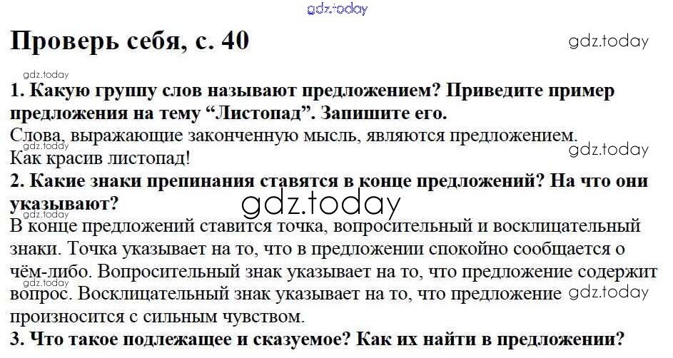 На страницах сайта gdz.today вы найдете учебный и вспомогательный материал, направленный на улучшения знаний школьной программы. ГДЗ - онлайн мир знаний Проверь себя Решение к части №1 (Упражнения) стр. 40 Учебнику по Русскому языку для 2 класса Канакина, Горецкий Просвещение Школа России 2013