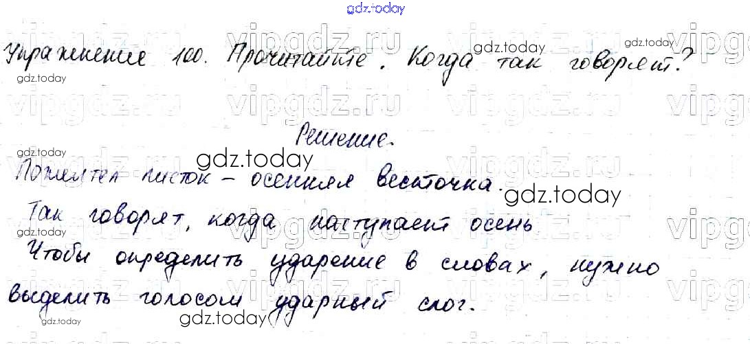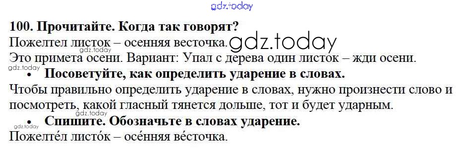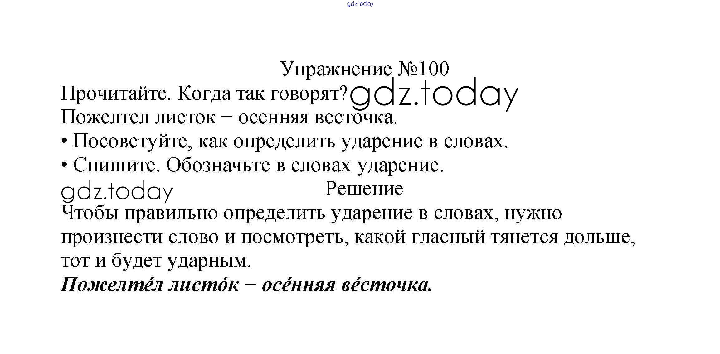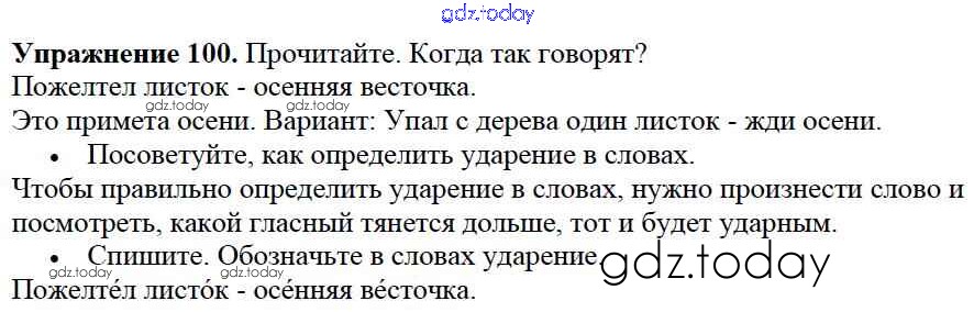 На страницах сайта gdz.today вы найдете учебный и вспомогательный материал, направленный на улучшения знаний школьной программы. ГДЗ - онлайн мир знаний Решение к части №1 (Упражнения) 100 Учебнику по Русскому языку для 2 класса Канакина, Горецкий Просвещение Школа России 2013