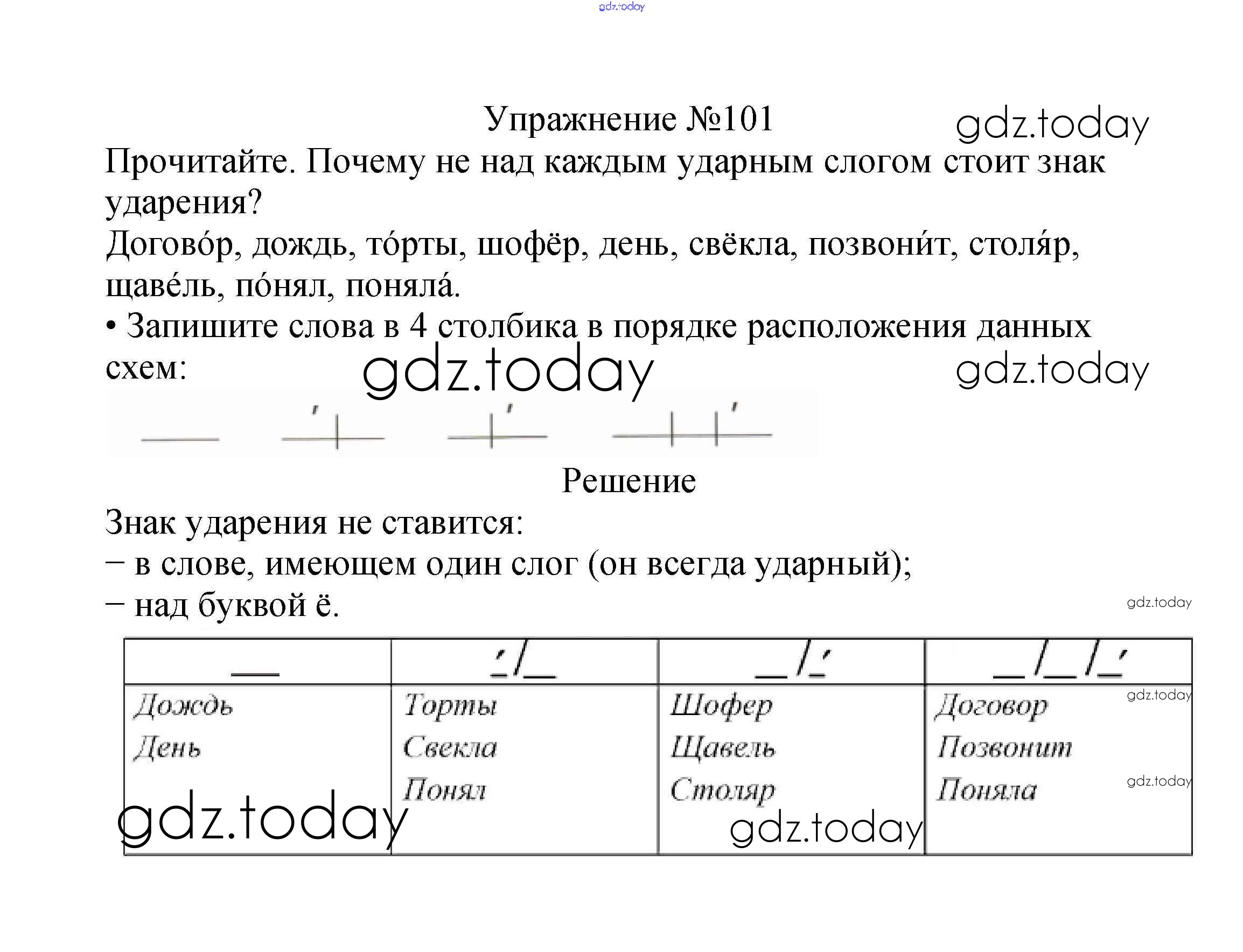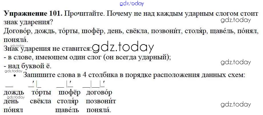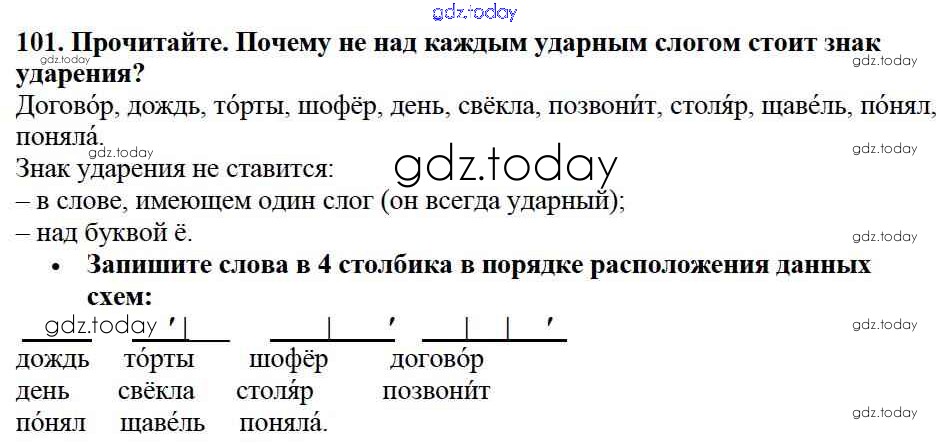 На страницах сайта gdz.today вы найдете учебный и вспомогательный материал, направленный на улучшения знаний школьной программы. ГДЗ - онлайн мир знаний Решение к части №1 (Упражнения) 101 Учебнику по Русскому языку для 2 класса Канакина, Горецкий Просвещение Школа России 2013
