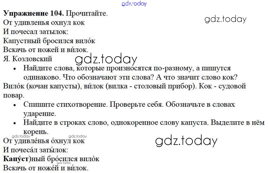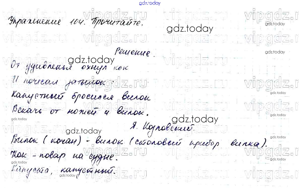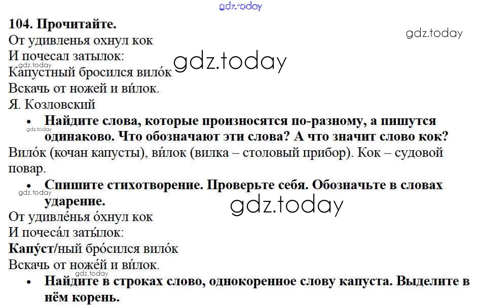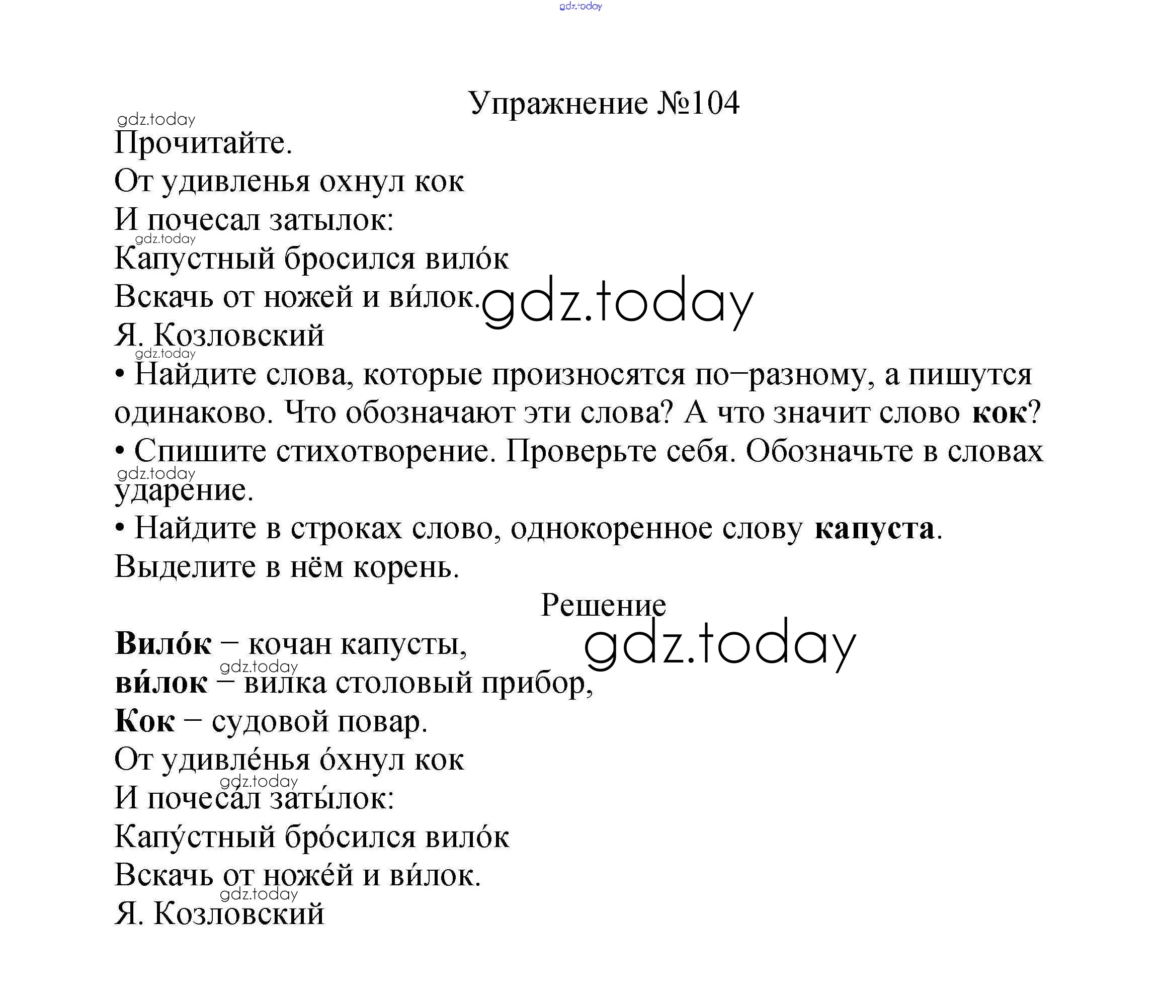 На страницах сайта gdz.today вы найдете учебный и вспомогательный материал, направленный на улучшения знаний школьной программы. ГДЗ - онлайн мир знаний Решение к части №1 (Упражнения) 104 Учебнику по Русскому языку для 2 класса Канакина, Горецкий Просвещение Школа России 2013