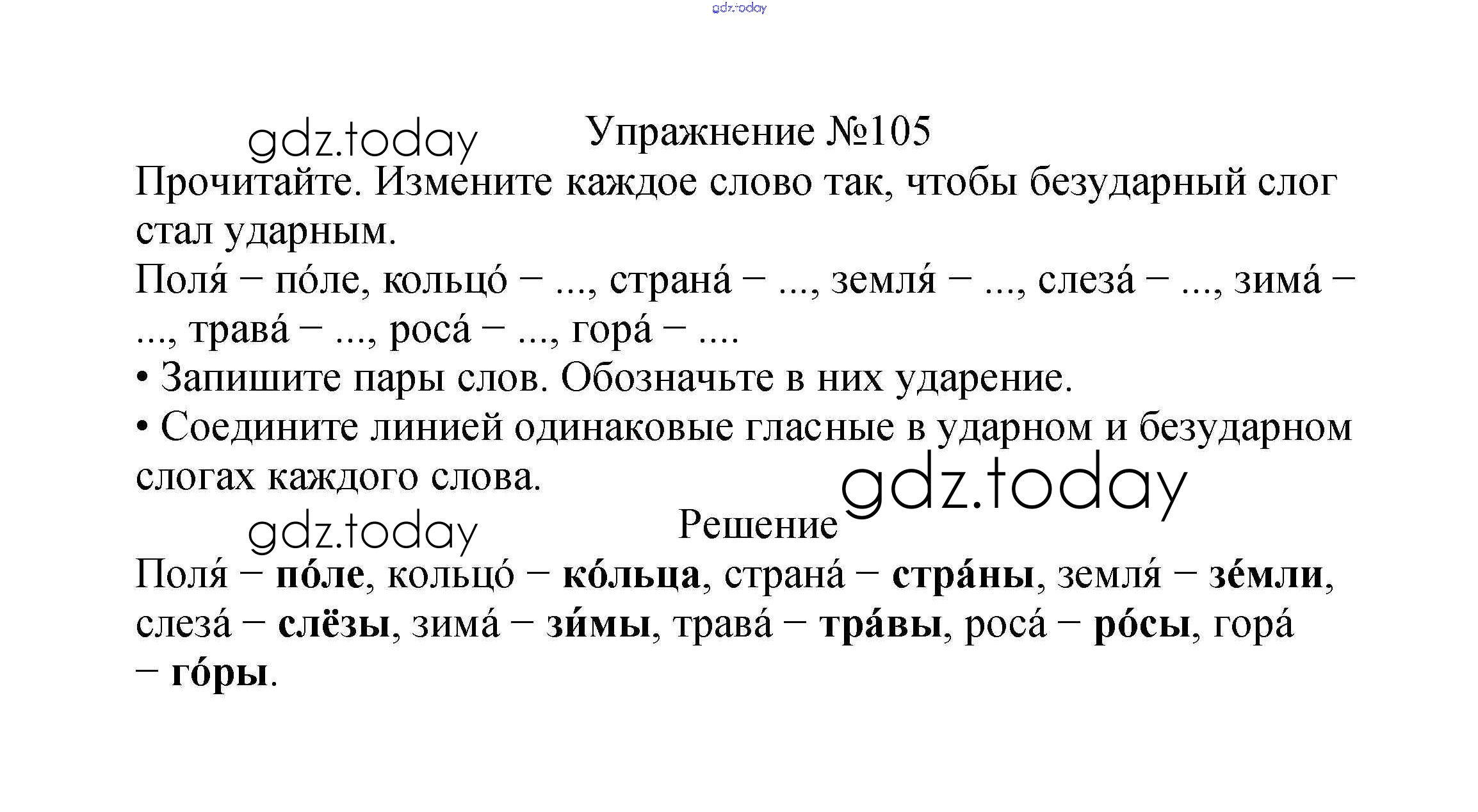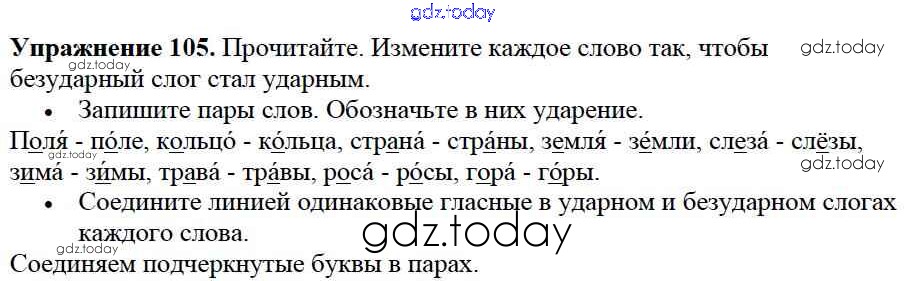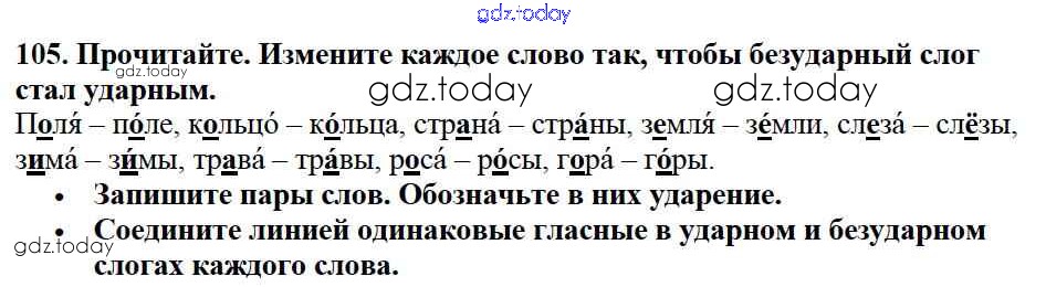 На страницах сайта gdz.today вы найдете учебный и вспомогательный материал, направленный на улучшения знаний школьной программы. ГДЗ - онлайн мир знаний Решение к части №1 (Упражнения) 105 Учебнику по Русскому языку для 2 класса Канакина, Горецкий Просвещение Школа России 2013
