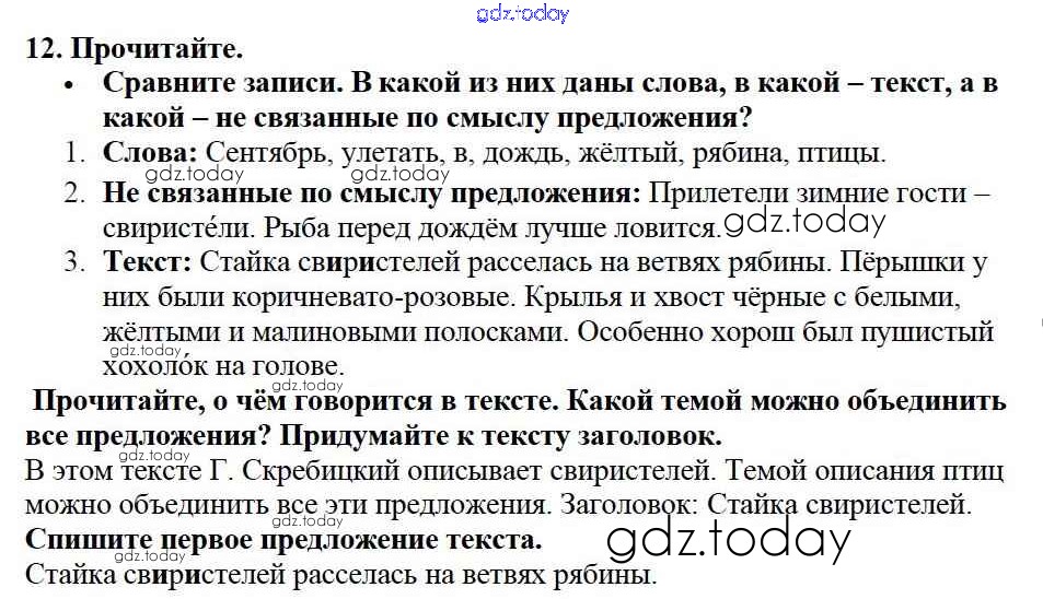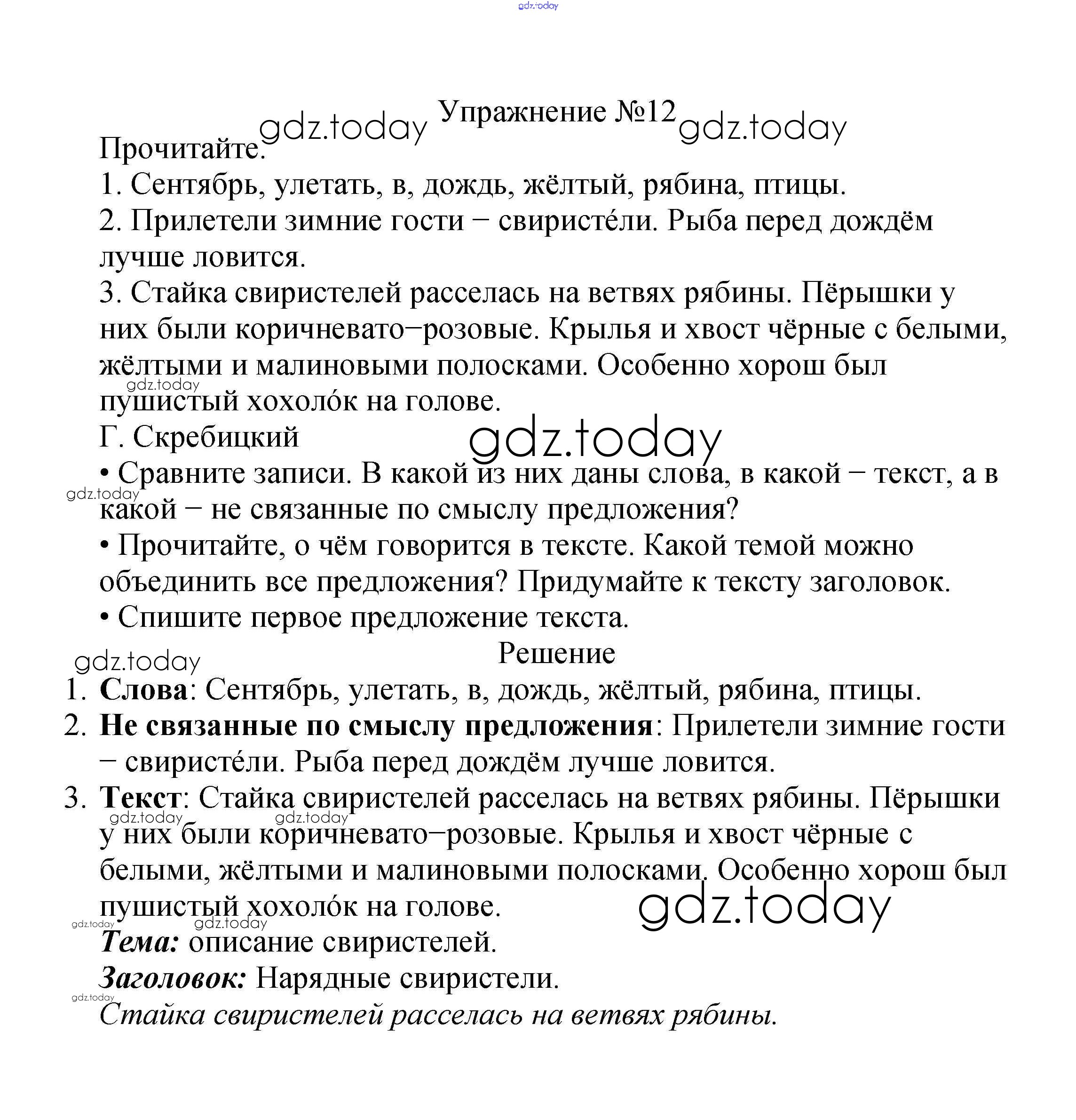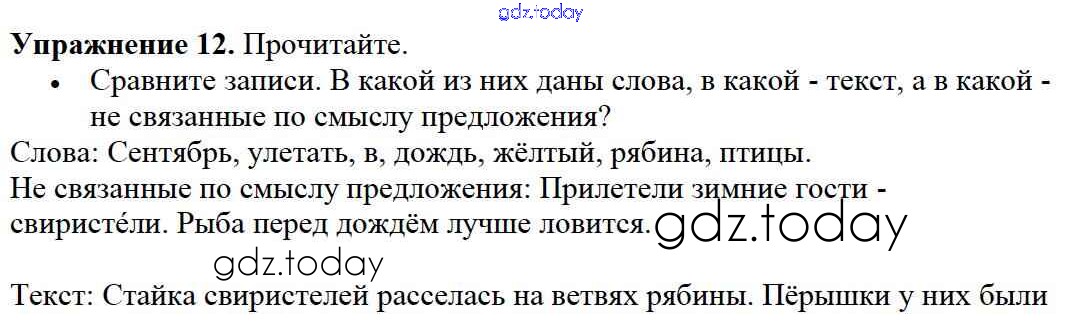 На страницах сайта gdz.today вы найдете учебный и вспомогательный материал, направленный на улучшения знаний школьной программы. ГДЗ - онлайн мир знаний Решение к части №1 (Упражнения) 12 Учебнику по Русскому языку для 2 класса Канакина, Горецкий Просвещение Школа России 2013