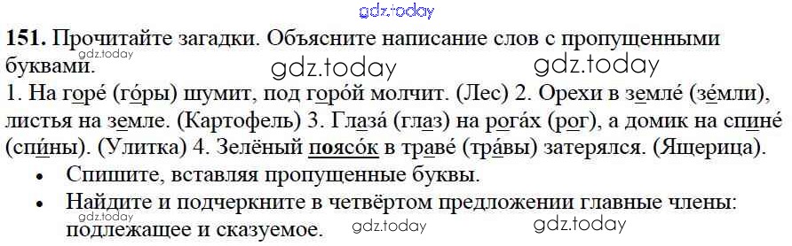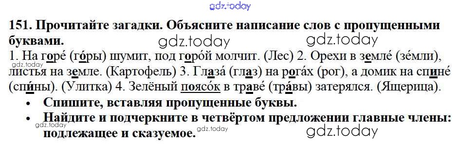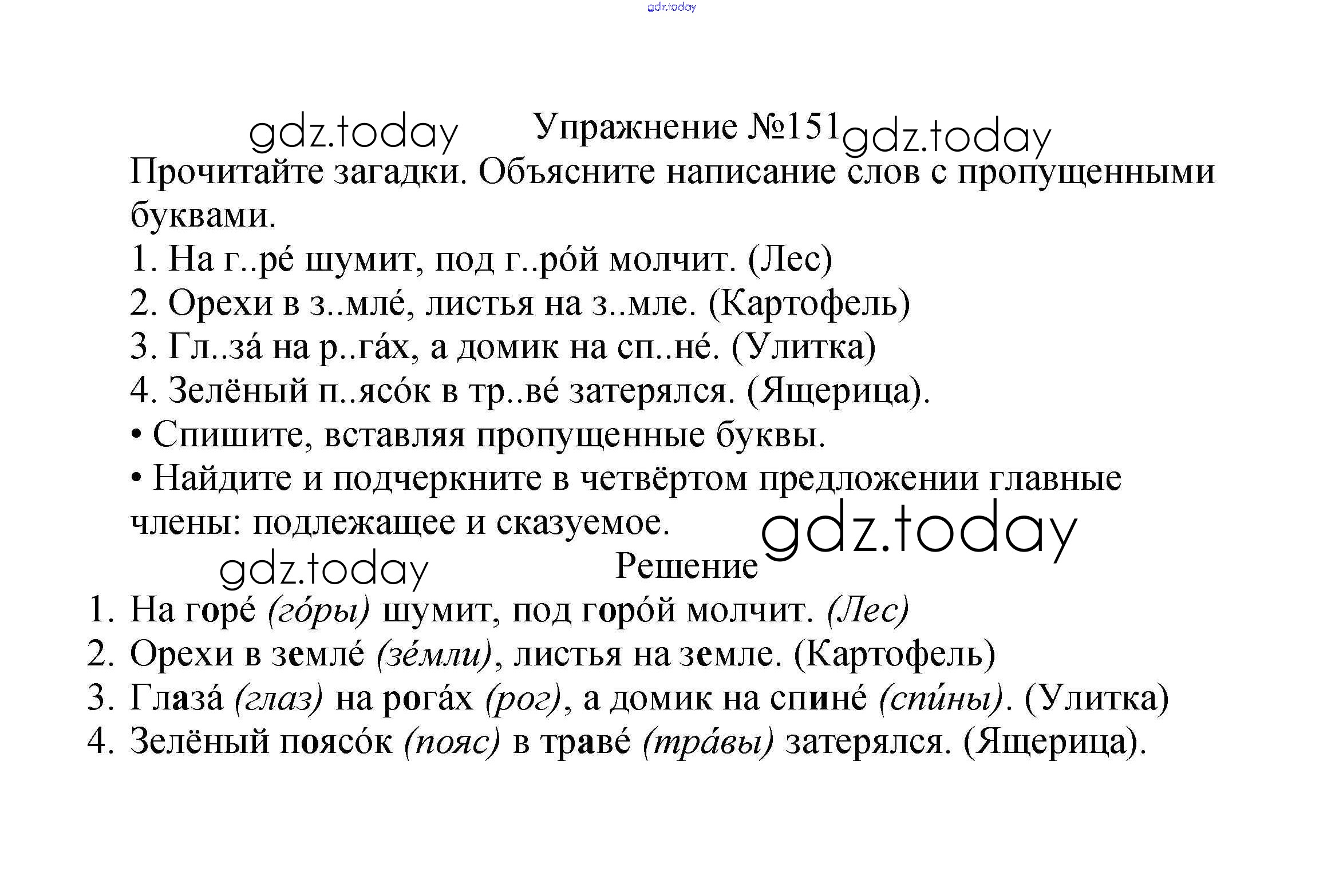На страницах сайта gdz.today вы найдете учебный и вспомогательный материал, направленный на улучшения знаний школьной программы. ГДЗ - онлайн мир знаний Решение к части №1 (Упражнения) 151 Учебнику по Русскому языку для 2 класса Канакина, Горецкий Просвещение Школа России 2013