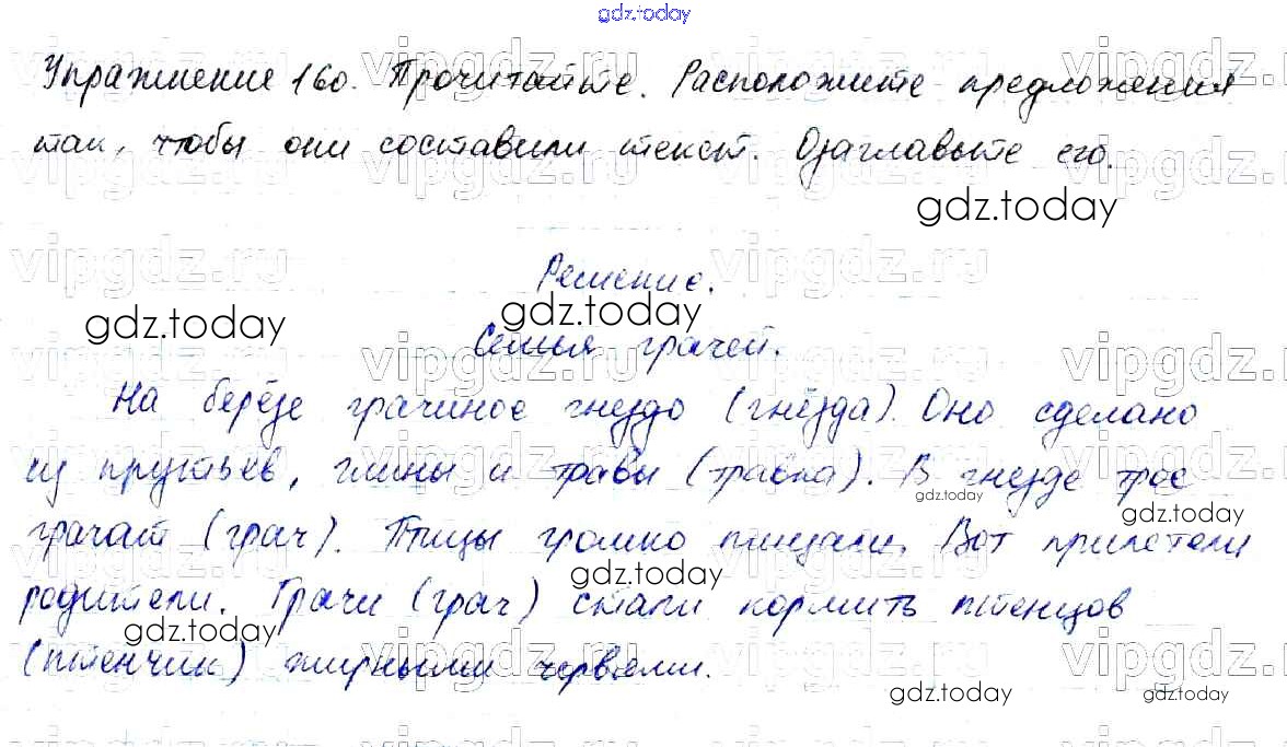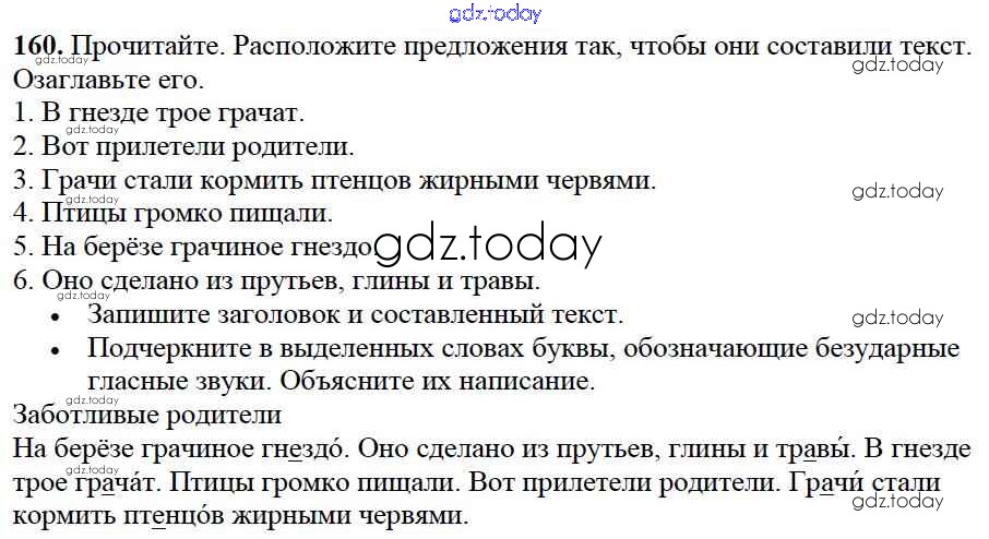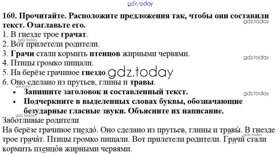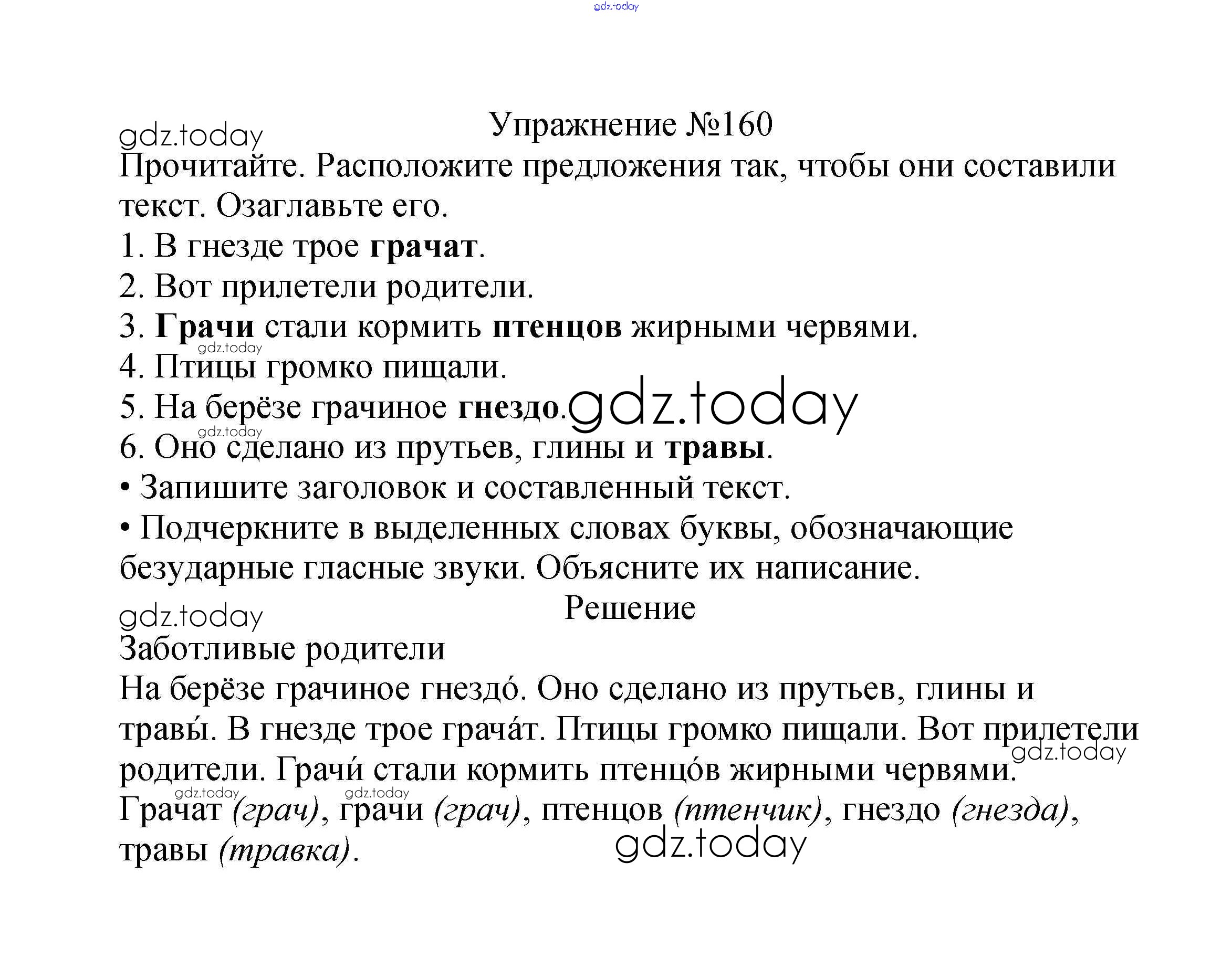На страницах сайта gdz.today вы найдете учебный и вспомогательный материал, направленный на улучшения знаний школьной программы. ГДЗ - онлайн мир знаний Решение к части №1 (Упражнения) 160 Учебнику по Русскому языку для 2 класса Канакина, Горецкий Просвещение Школа России 2013
