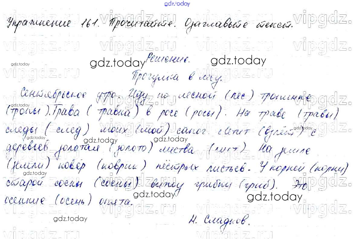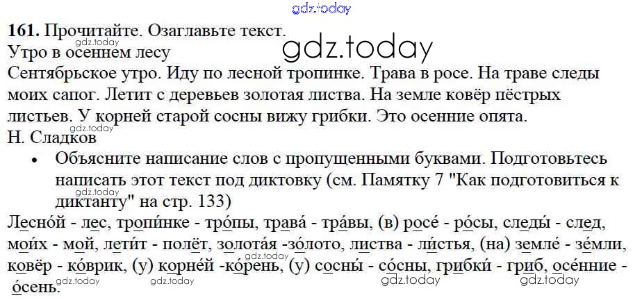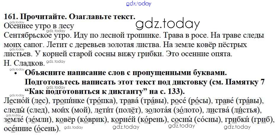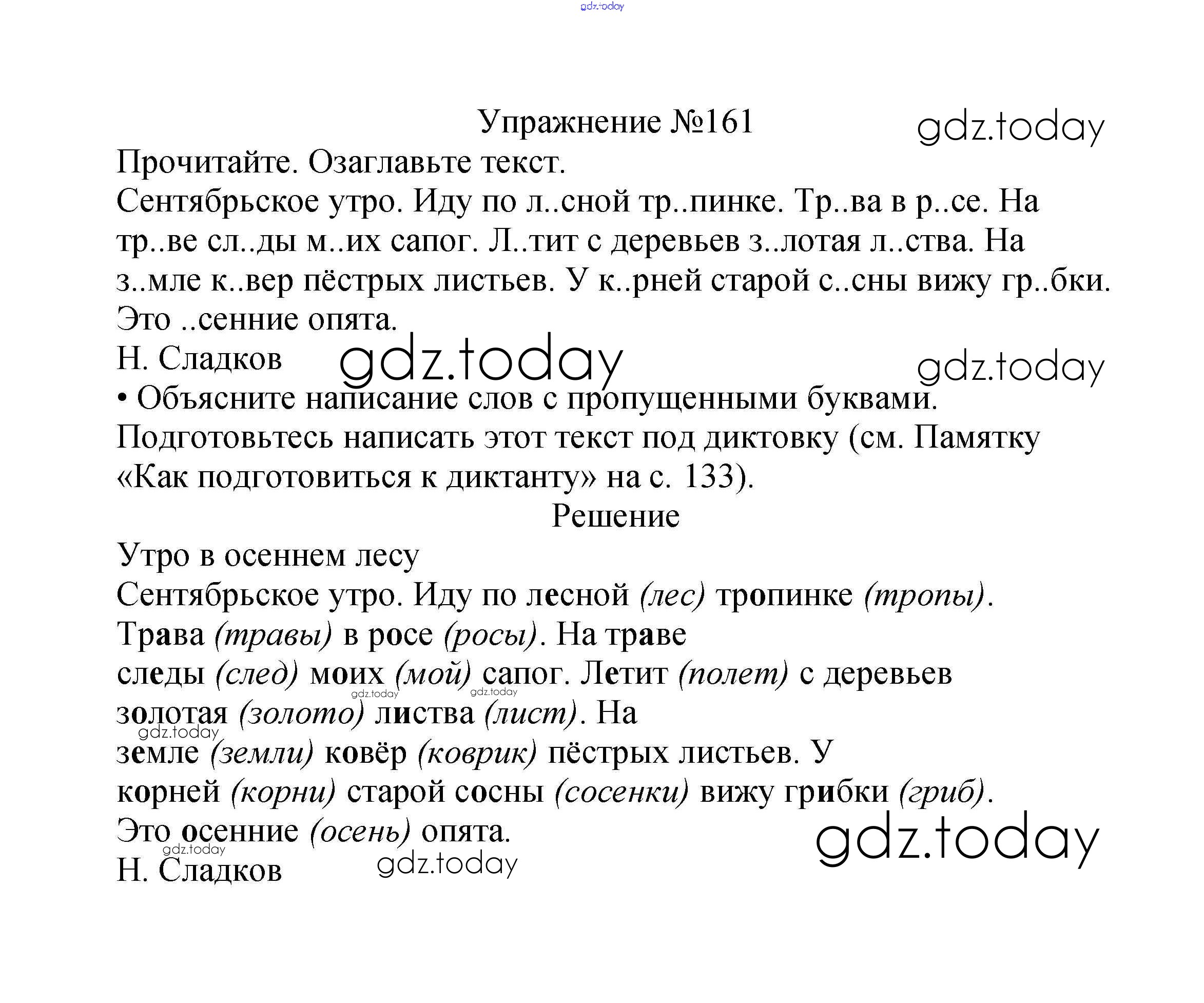 На страницах сайта gdz.today вы найдете учебный и вспомогательный материал, направленный на улучшения знаний школьной программы. ГДЗ - онлайн мир знаний Решение к части №1 (Упражнения) 161 Учебнику по Русскому языку для 2 класса Канакина, Горецкий Просвещение Школа России 2013