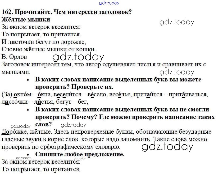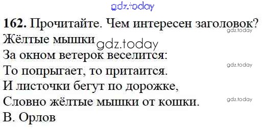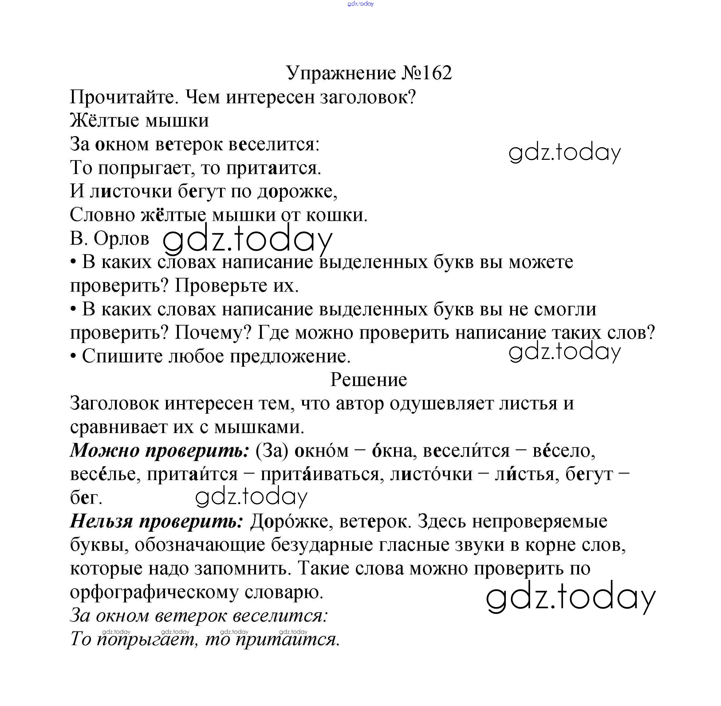 На страницах сайта gdz.today вы найдете учебный и вспомогательный материал, направленный на улучшения знаний школьной программы. ГДЗ - онлайн мир знаний Решение к части №1 (Упражнения) 162 Учебнику по Русскому языку для 2 класса Канакина, Горецкий Просвещение Школа России 2013