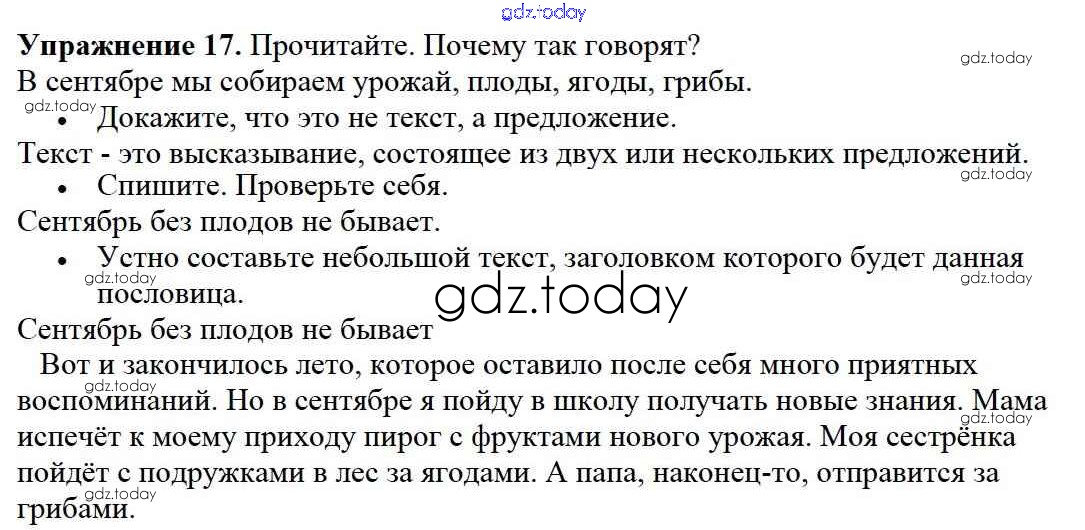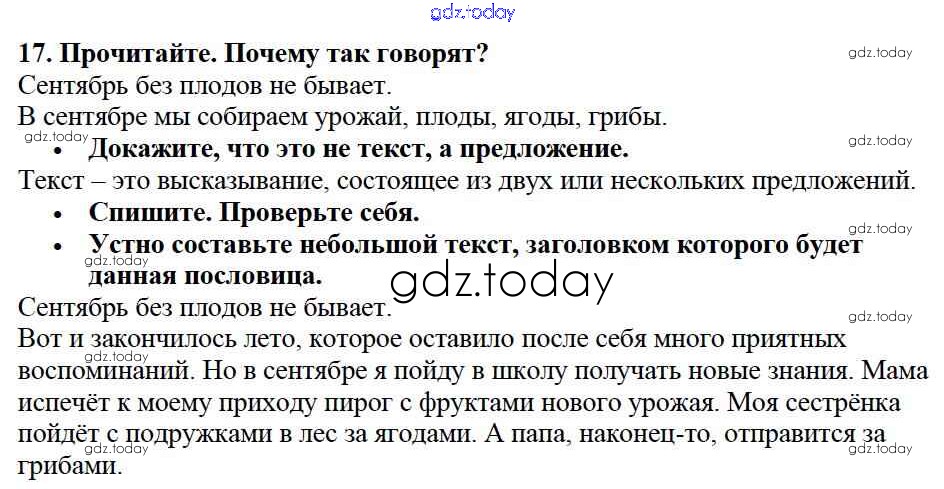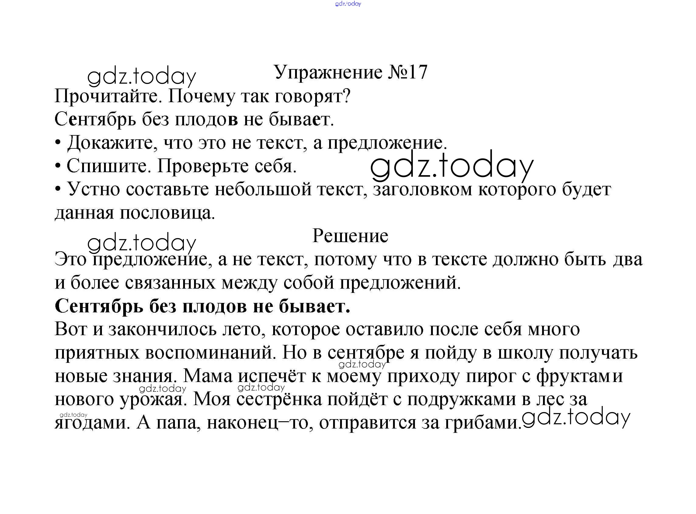 На страницах сайта gdz.today вы найдете учебный и вспомогательный материал, направленный на улучшения знаний школьной программы. ГДЗ - онлайн мир знаний Решение к части №1 (Упражнения) 17 Учебнику по Русскому языку для 2 класса Канакина, Горецкий Просвещение Школа России 2013