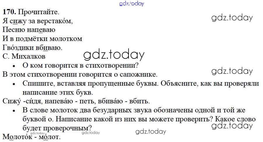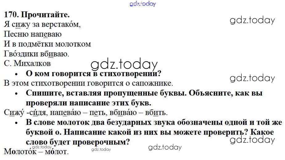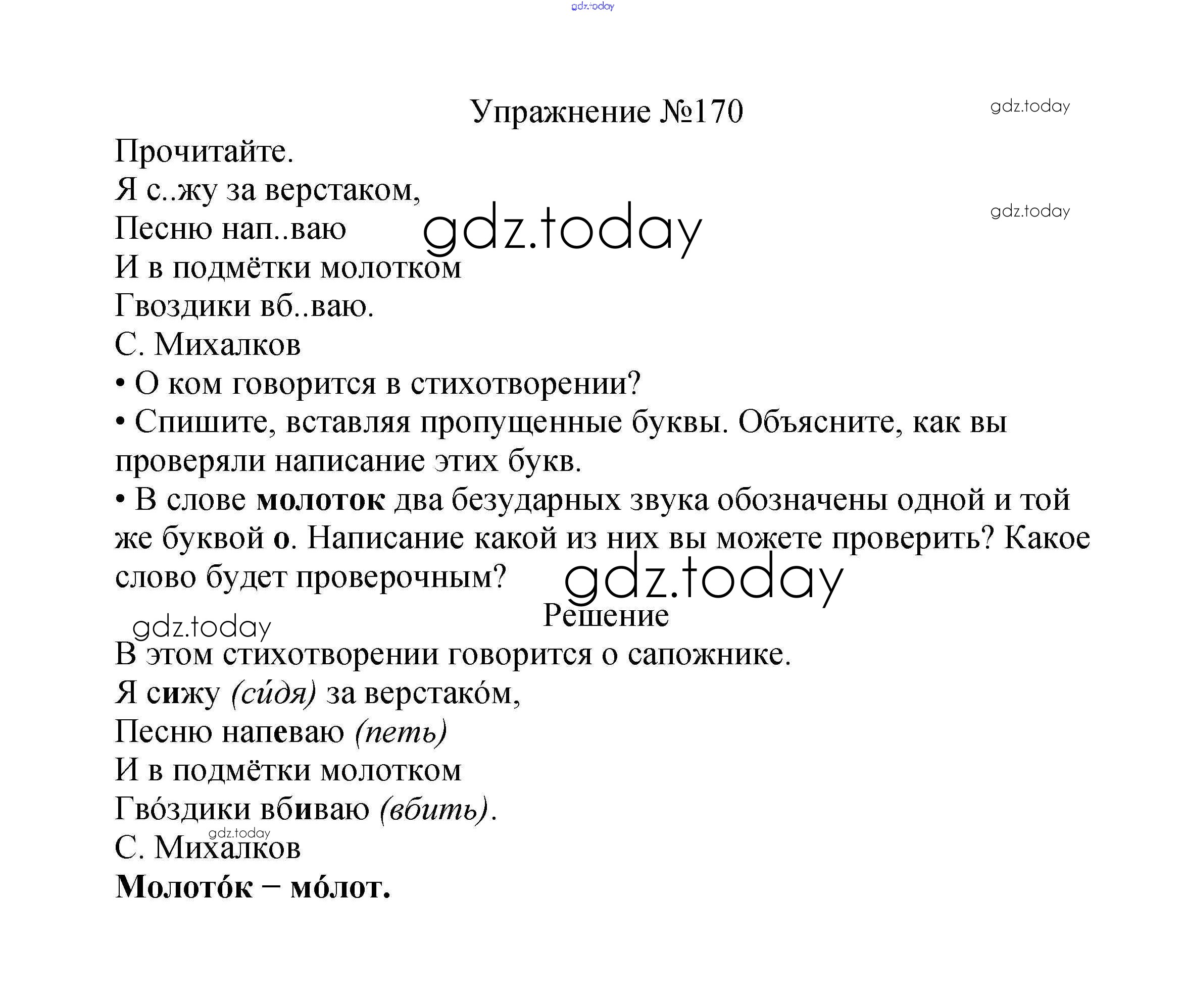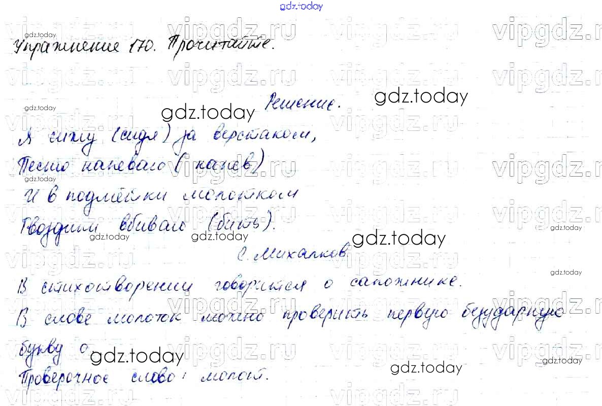 На страницах сайта gdz.today вы найдете учебный и вспомогательный материал, направленный на улучшения знаний школьной программы. ГДЗ - онлайн мир знаний Решение к части №1 (Упражнения) 170 Учебнику по Русскому языку для 2 класса Канакина, Горецкий Просвещение Школа России 2013