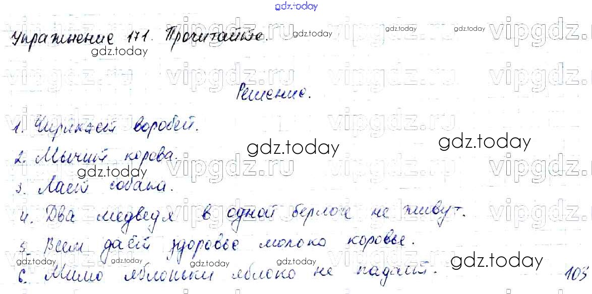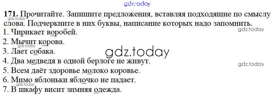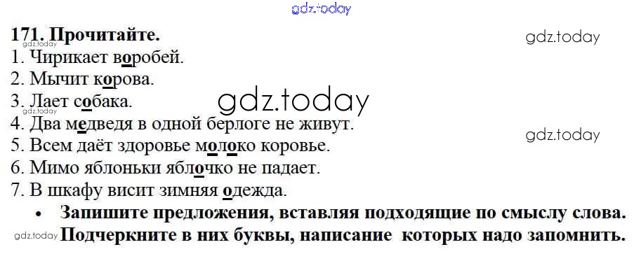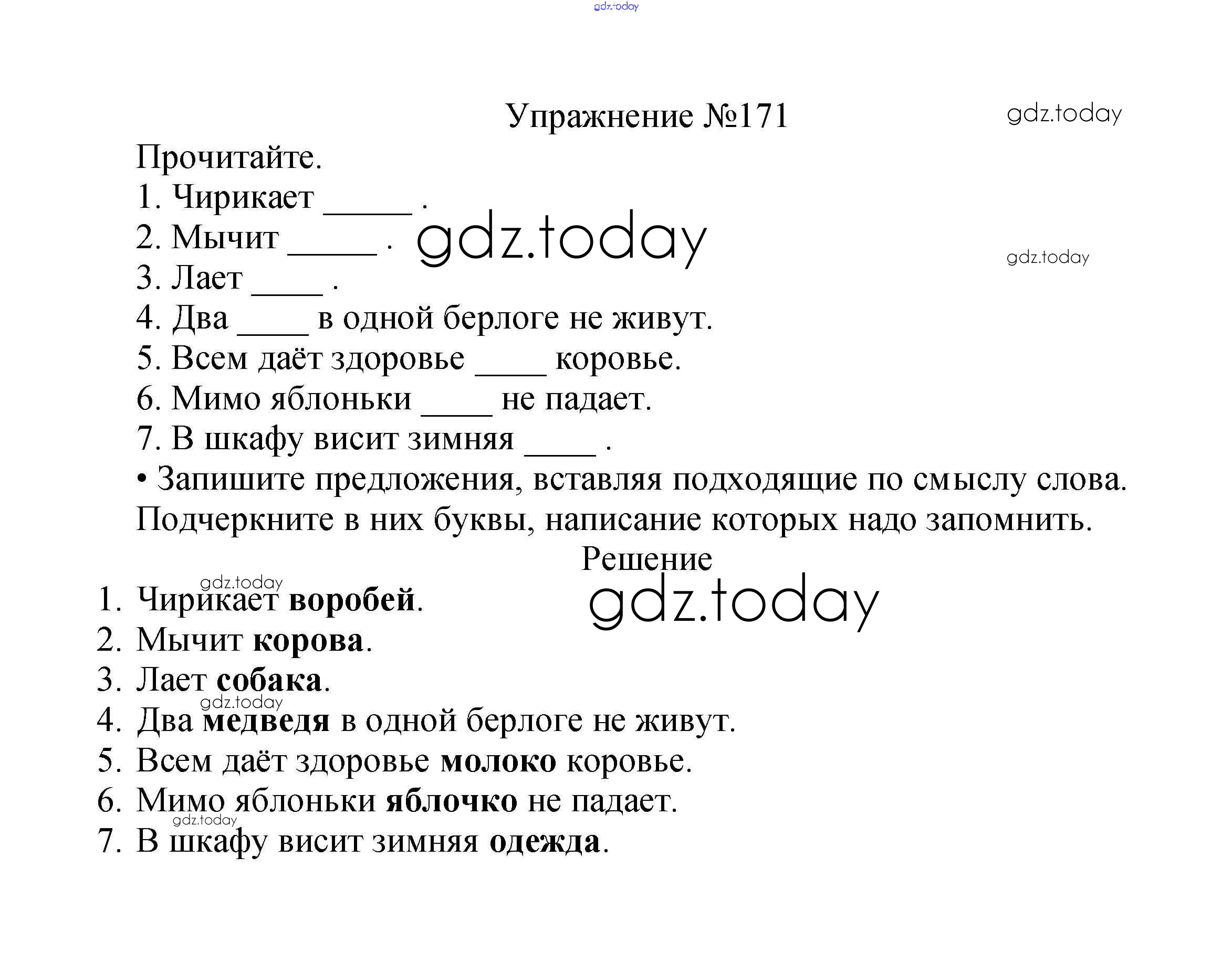 На страницах сайта gdz.today вы найдете учебный и вспомогательный материал, направленный на улучшения знаний школьной программы. ГДЗ - онлайн мир знаний Решение к части №1 (Упражнения) 171 Учебнику по Русскому языку для 2 класса Канакина, Горецкий Просвещение Школа России 2013