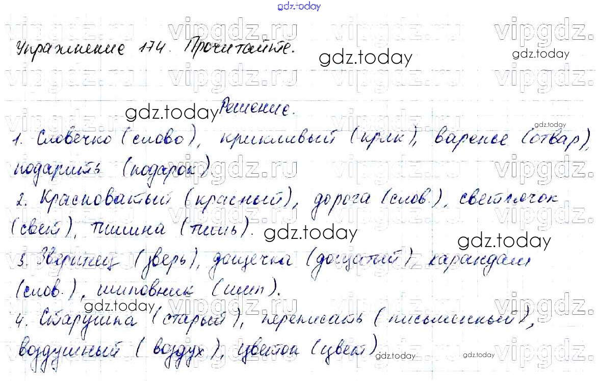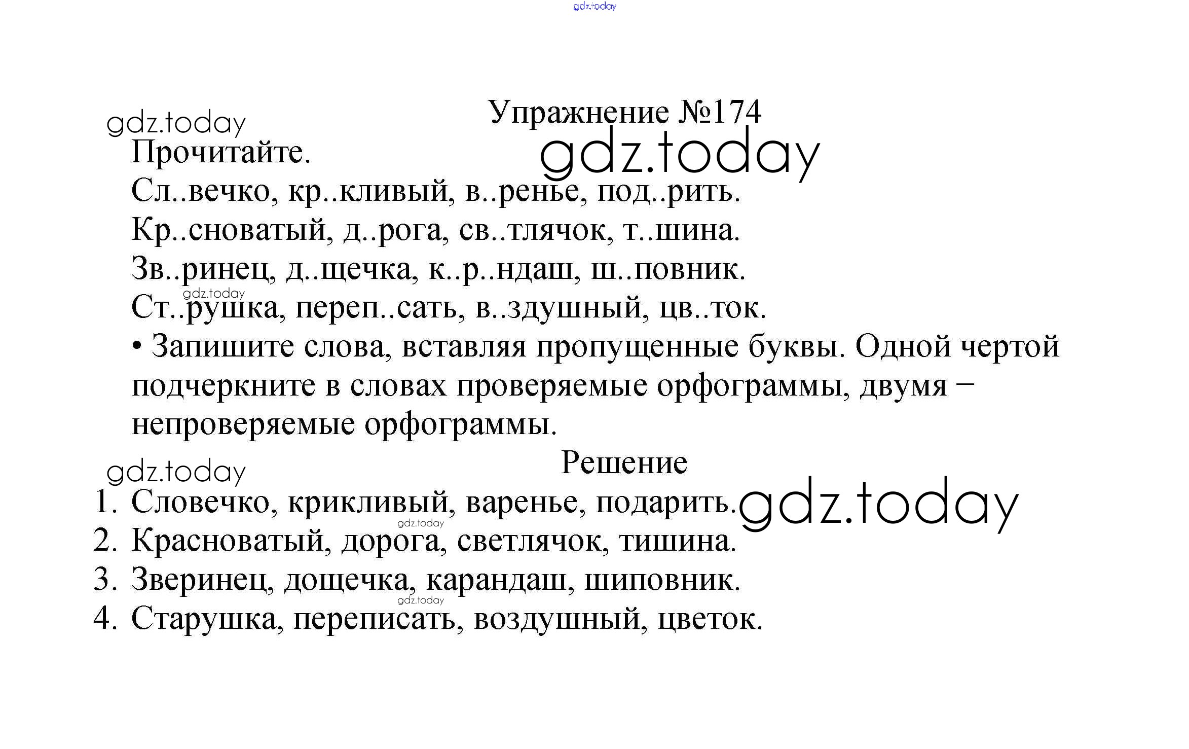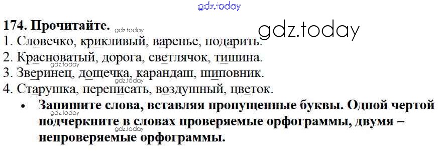 На страницах сайта gdz.today вы найдете учебный и вспомогательный материал, направленный на улучшения знаний школьной программы. ГДЗ - онлайн мир знаний Решение к части №1 (Упражнения) 174 Учебнику по Русскому языку для 2 класса Канакина, Горецкий Просвещение Школа России 2013