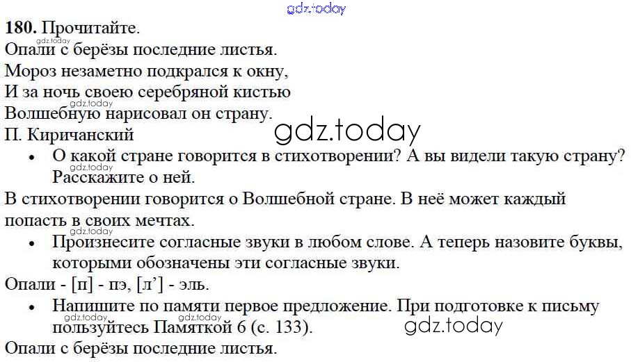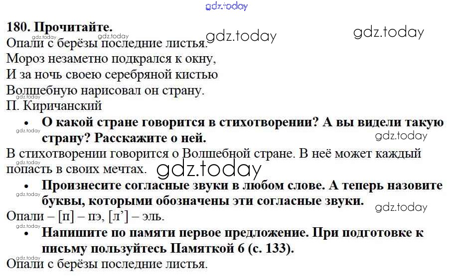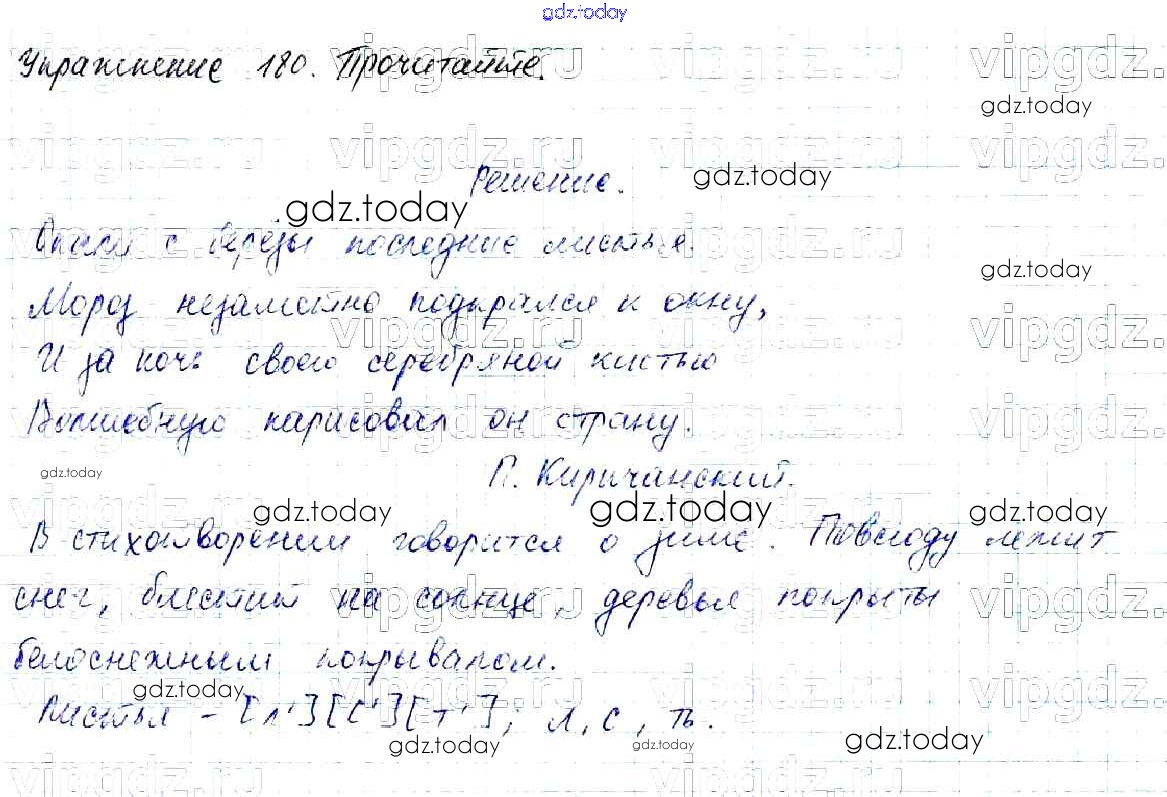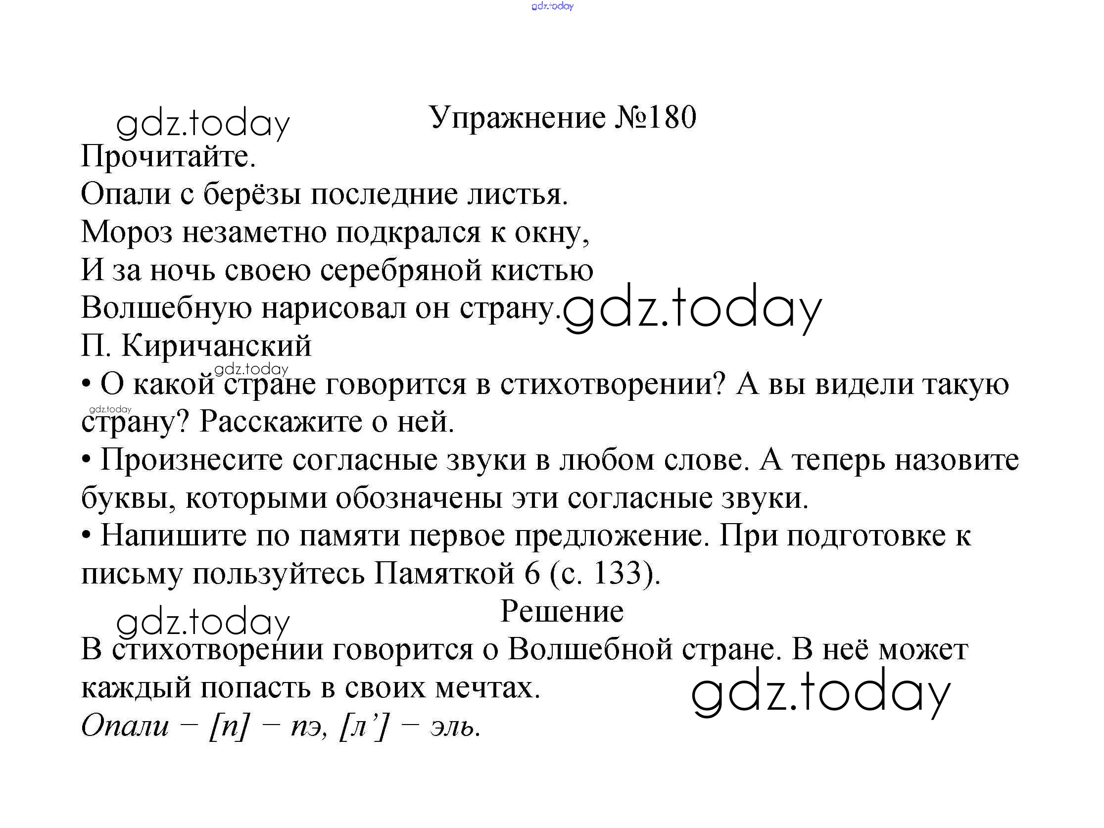 На страницах сайта gdz.today вы найдете учебный и вспомогательный материал, направленный на улучшения знаний школьной программы. ГДЗ - онлайн мир знаний Решение к части №1 (Упражнения) 180 Учебнику по Русскому языку для 2 класса Канакина, Горецкий Просвещение Школа России 2013