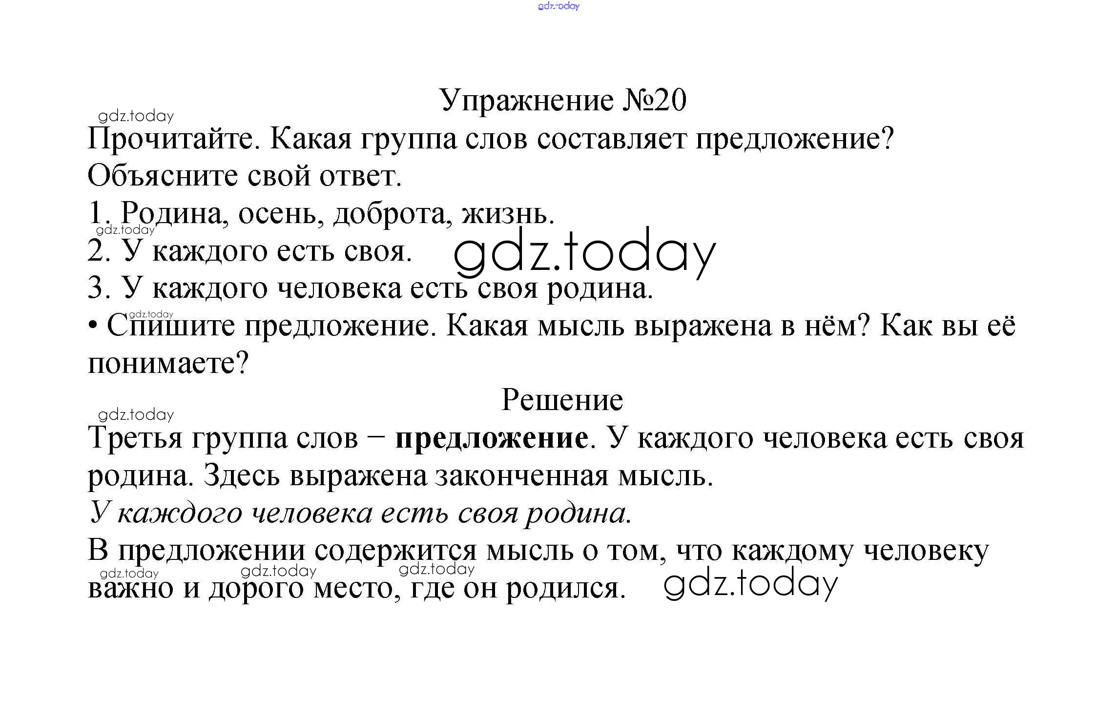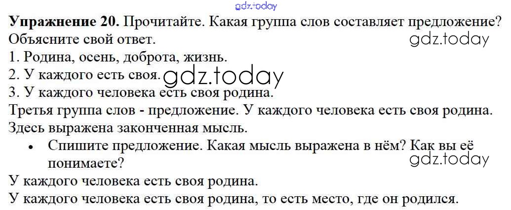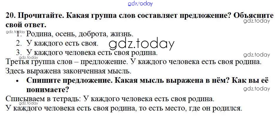 На страницах сайта gdz.today вы найдете учебный и вспомогательный материал, направленный на улучшения знаний школьной программы. ГДЗ - онлайн мир знаний Решение к части №1 (Упражнения) 20 Учебнику по Русскому языку для 2 класса Канакина, Горецкий Просвещение Школа России 2013