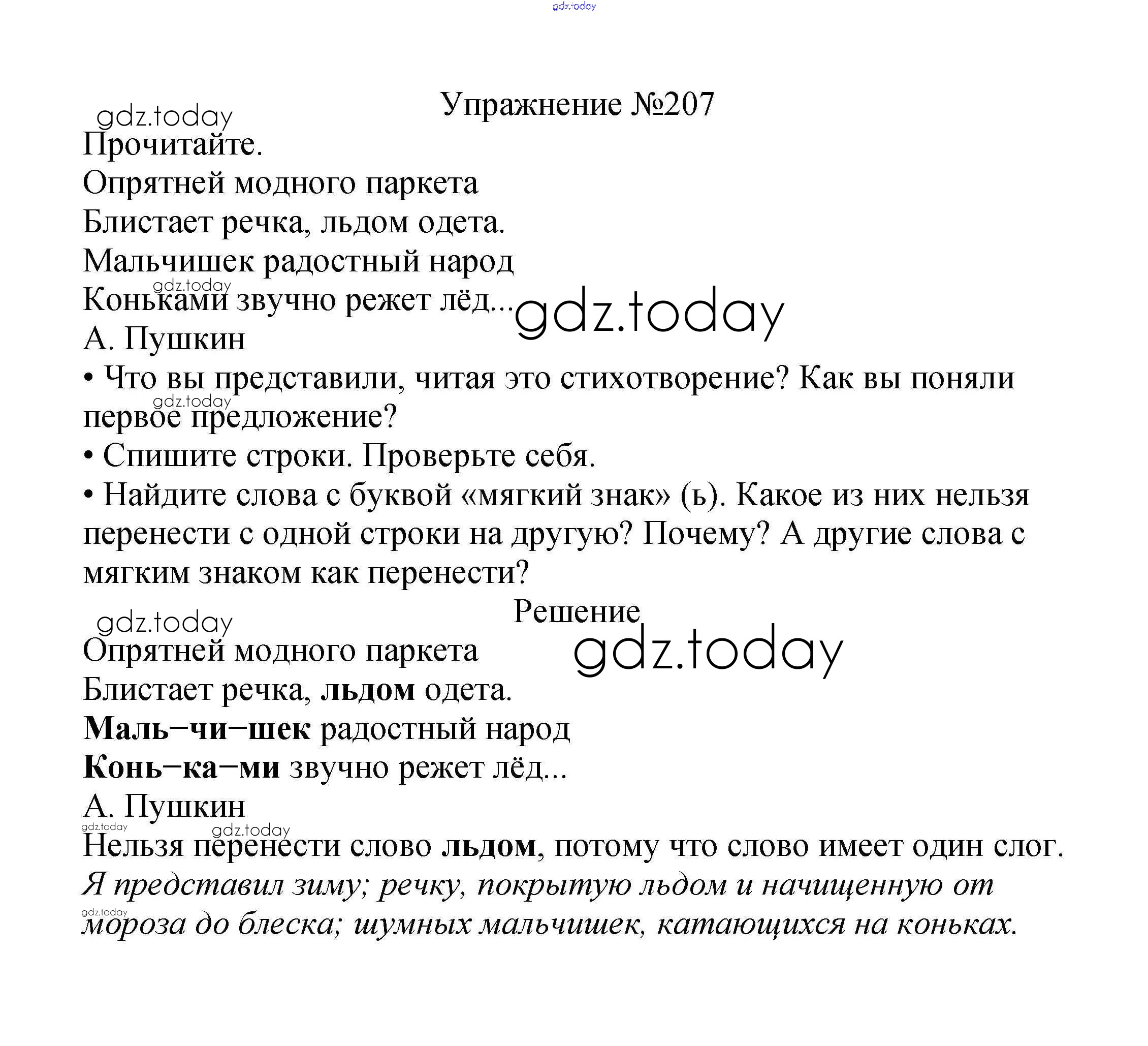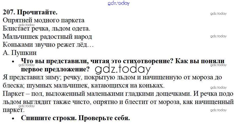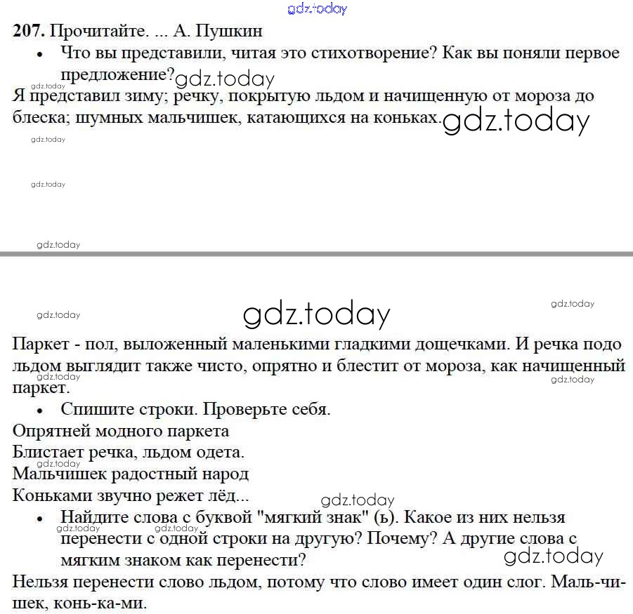 На страницах сайта gdz.today вы найдете учебный и вспомогательный материал, направленный на улучшения знаний школьной программы. ГДЗ - онлайн мир знаний Решение к части №1 (Упражнения) 207 Учебнику по Русскому языку для 2 класса Канакина, Горецкий Просвещение Школа России 2013