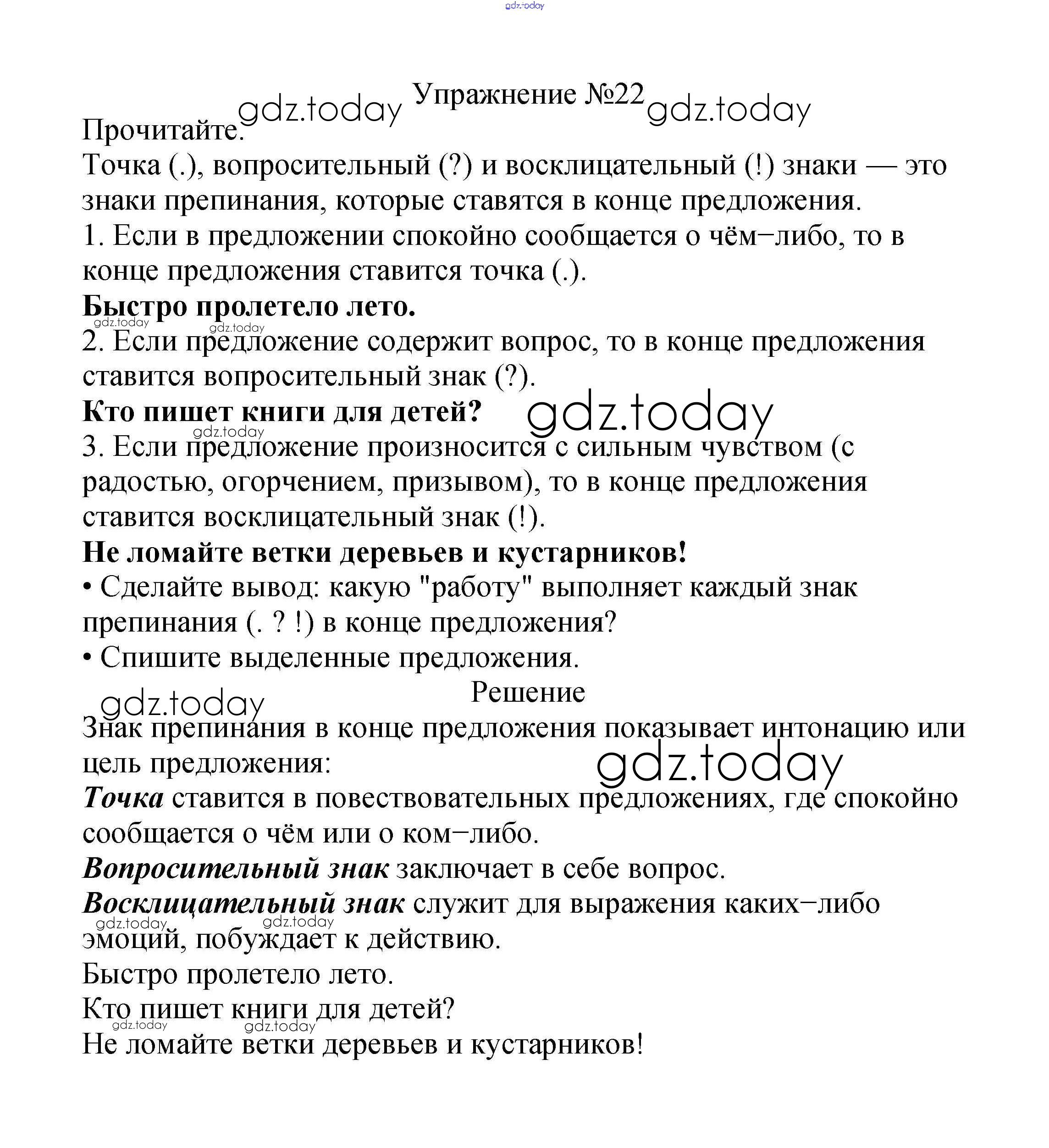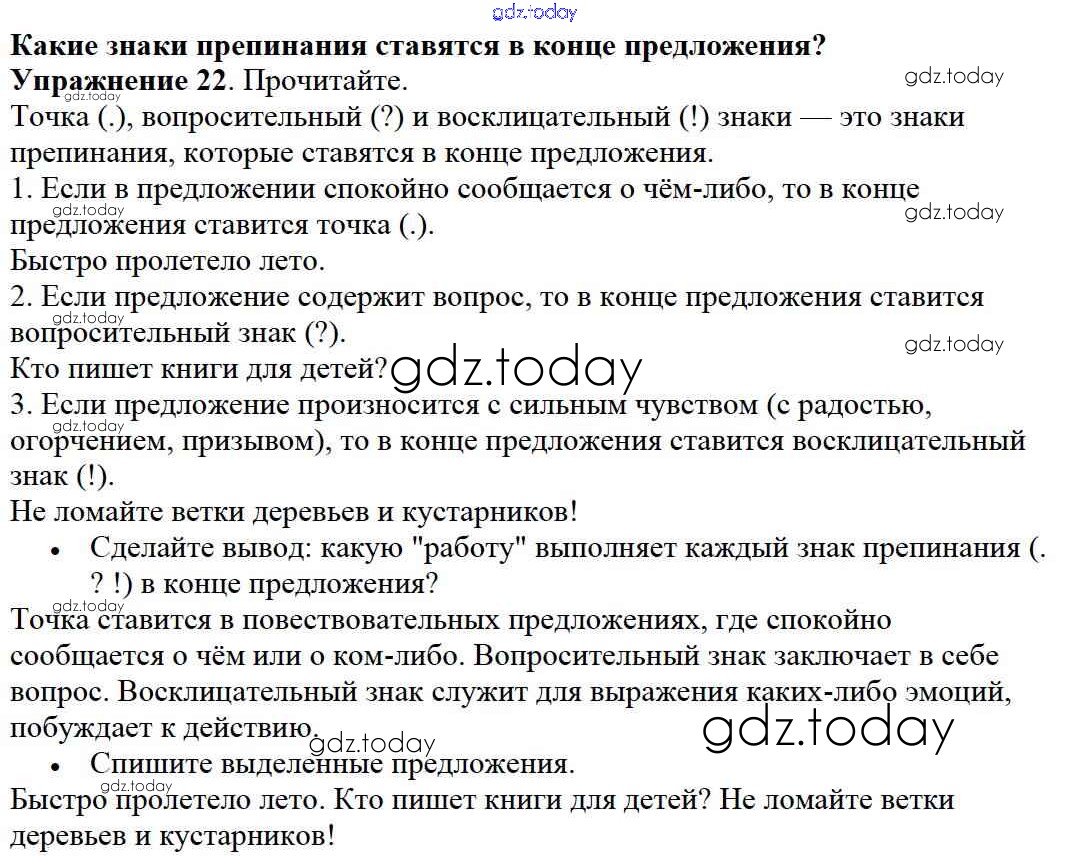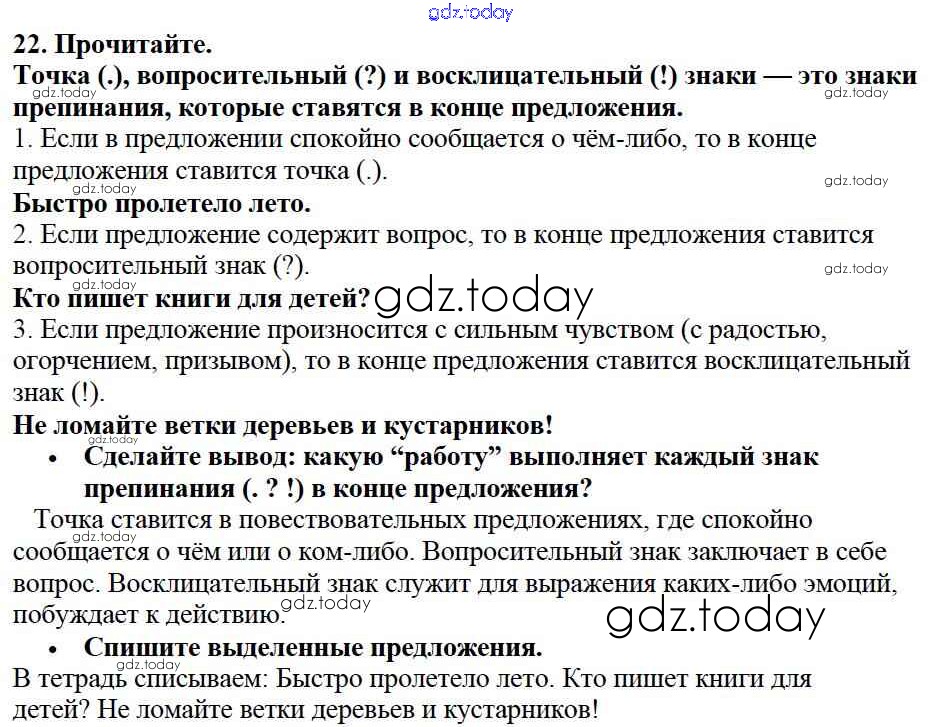 На страницах сайта gdz.today вы найдете учебный и вспомогательный материал, направленный на улучшения знаний школьной программы. ГДЗ - онлайн мир знаний Решение к части №1 (Упражнения) 22 Учебнику по Русскому языку для 2 класса Канакина, Горецкий Просвещение Школа России 2013