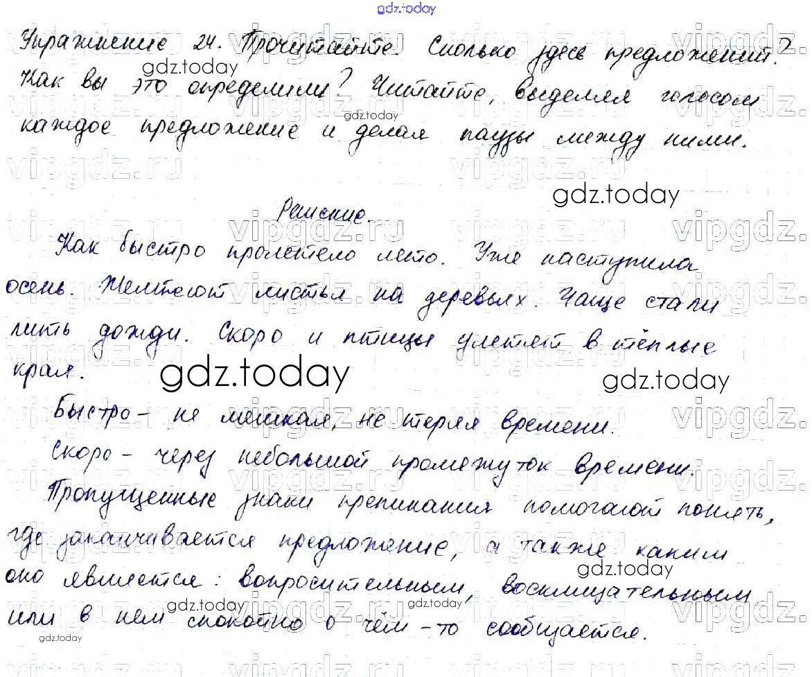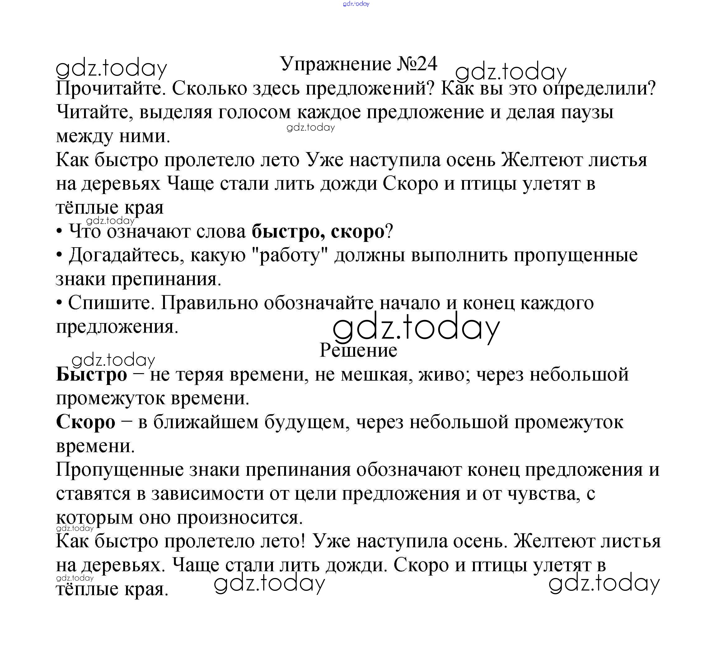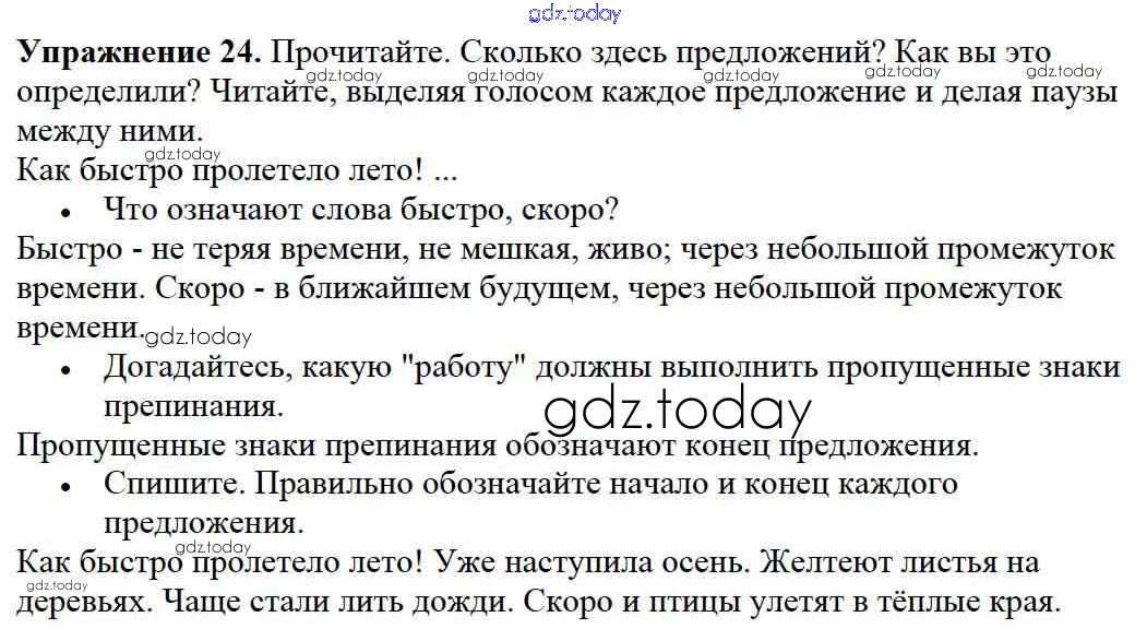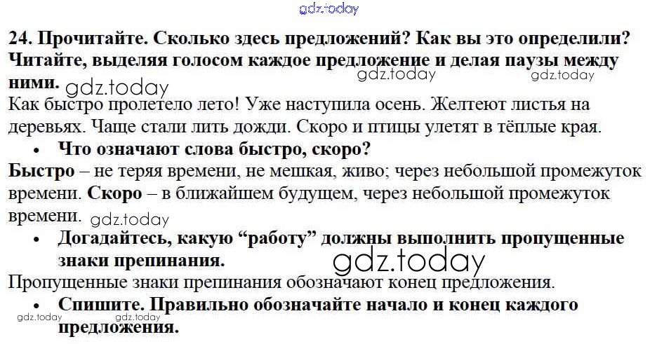 На страницах сайта gdz.today вы найдете учебный и вспомогательный материал, направленный на улучшения знаний школьной программы. ГДЗ - онлайн мир знаний Решение к части №1 (Упражнения) 24 Учебнику по Русскому языку для 2 класса Канакина, Горецкий Просвещение Школа России 2013