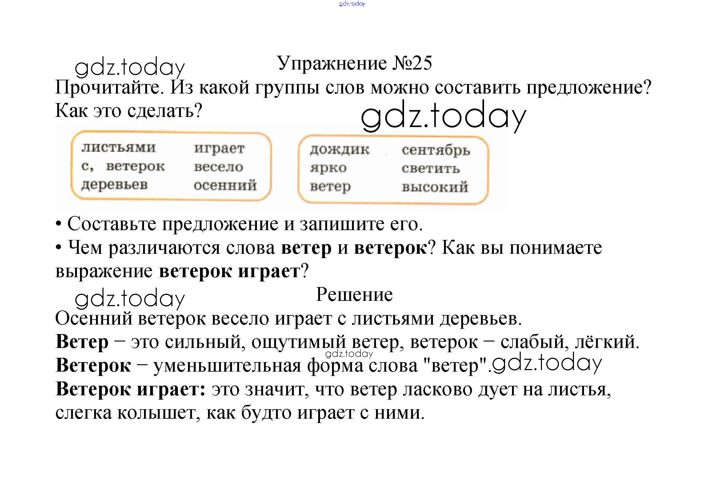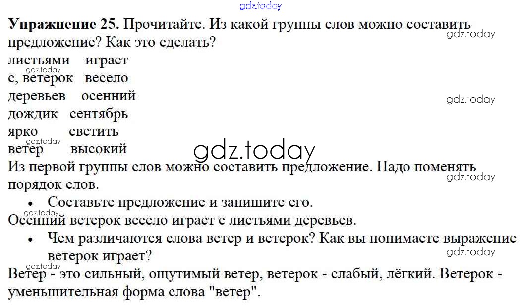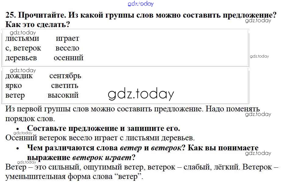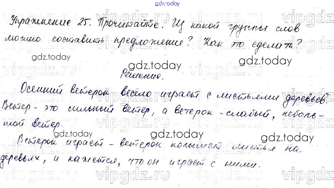 На страницах сайта gdz.today вы найдете учебный и вспомогательный материал, направленный на улучшения знаний школьной программы. ГДЗ - онлайн мир знаний Решение к части №1 (Упражнения) 25 Учебнику по Русскому языку для 2 класса Канакина, Горецкий Просвещение Школа России 2013