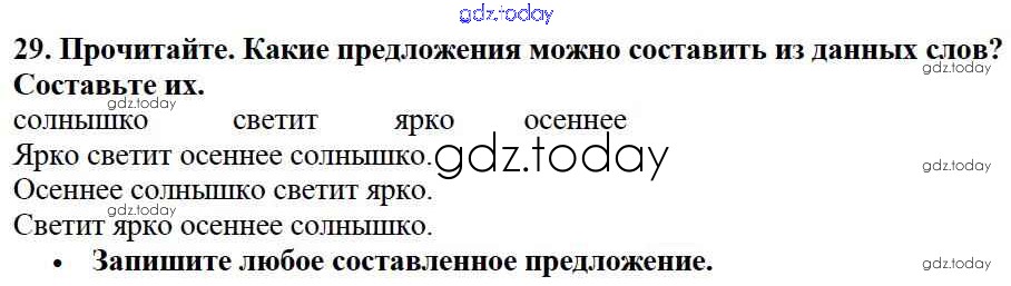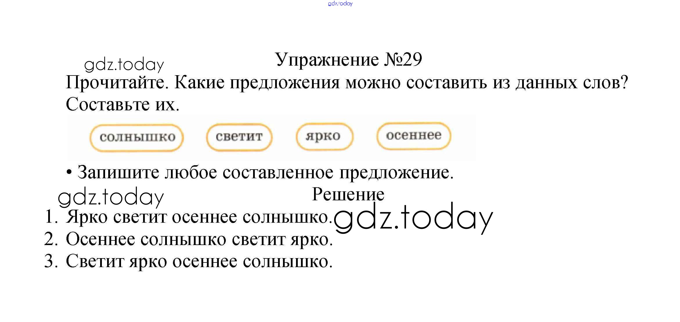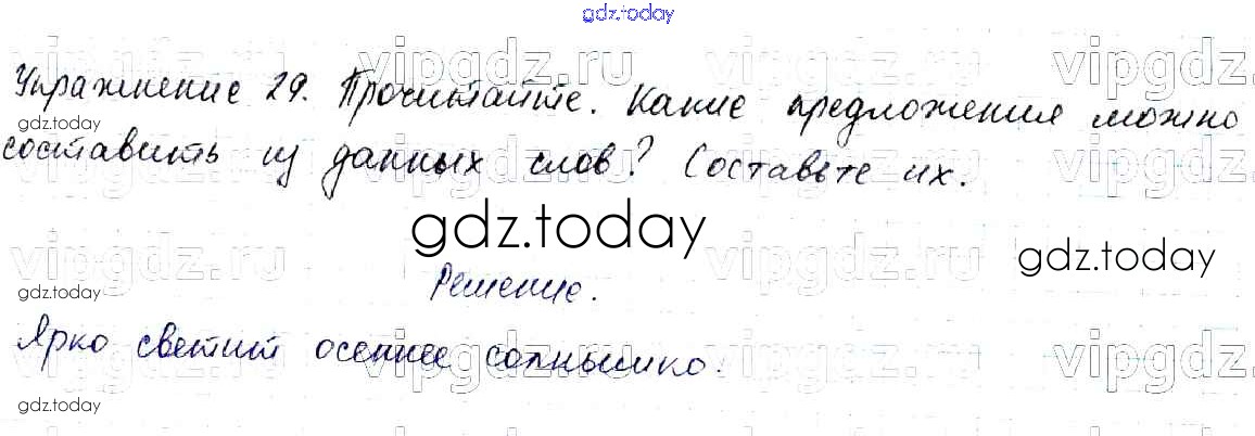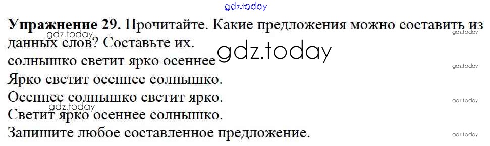 На страницах сайта gdz.today вы найдете учебный и вспомогательный материал, направленный на улучшения знаний школьной программы. ГДЗ - онлайн мир знаний Решение к части №1 (Упражнения) 29 Учебнику по Русскому языку для 2 класса Канакина, Горецкий Просвещение Школа России 2013