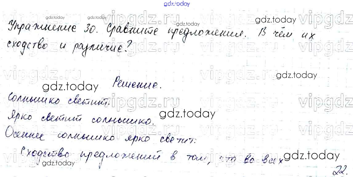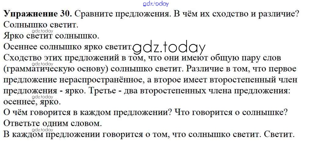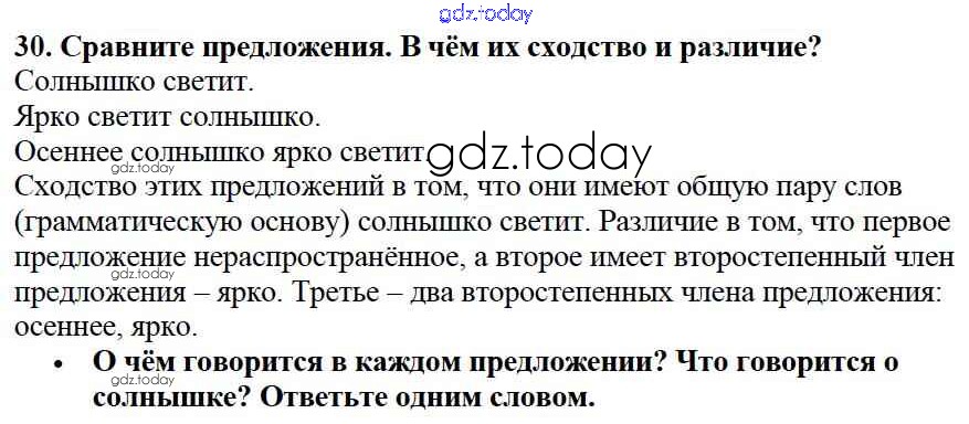 На страницах сайта gdz.today вы найдете учебный и вспомогательный материал, направленный на улучшения знаний школьной программы. ГДЗ - онлайн мир знаний Решение к части №1 (Упражнения) 30 Учебнику по Русскому языку для 2 класса Канакина, Горецкий Просвещение Школа России 2013
