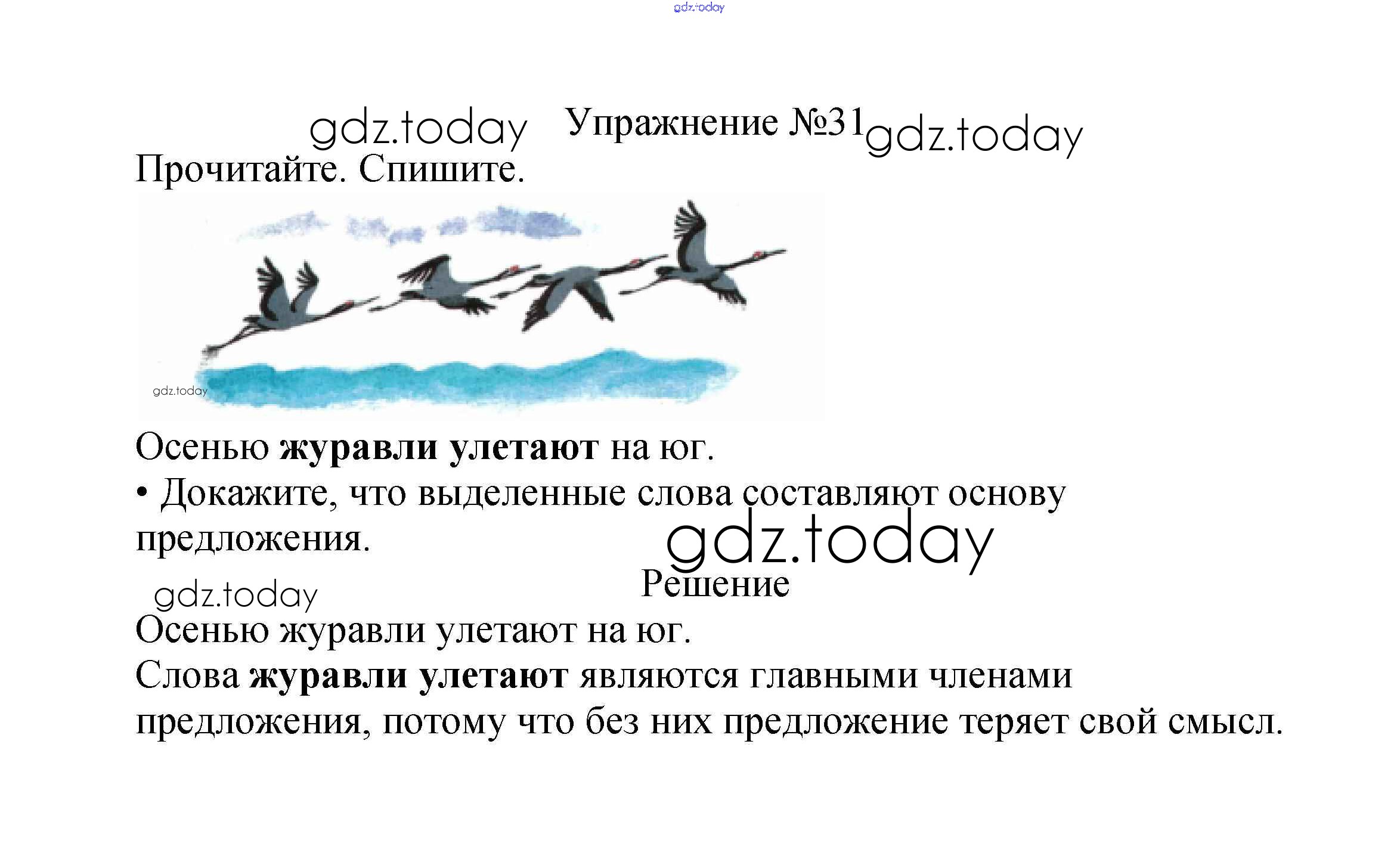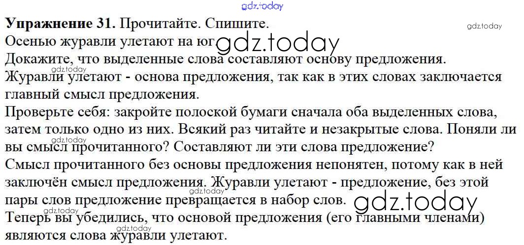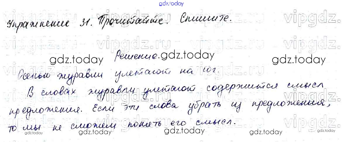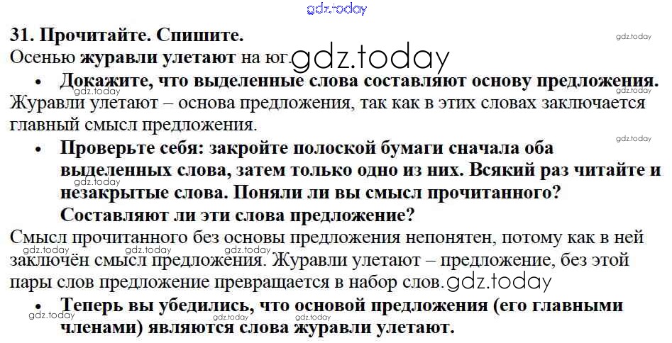На страницах сайта gdz.today вы найдете учебный и вспомогательный материал, направленный на улучшения знаний школьной программы. ГДЗ - онлайн мир знаний Решение к части №1 (Упражнения) 31 Учебнику по Русскому языку для 2 класса Канакина, Горецкий Просвещение Школа России 2013