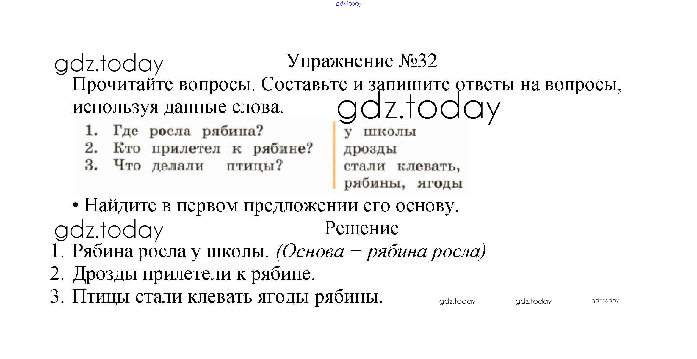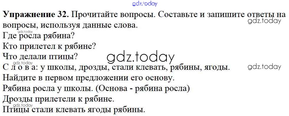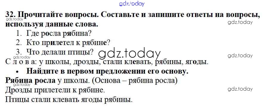 На страницах сайта gdz.today вы найдете учебный и вспомогательный материал, направленный на улучшения знаний школьной программы. ГДЗ - онлайн мир знаний Решение к части №1 (Упражнения) 32 Учебнику по Русскому языку для 2 класса Канакина, Горецкий Просвещение Школа России 2013