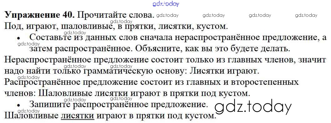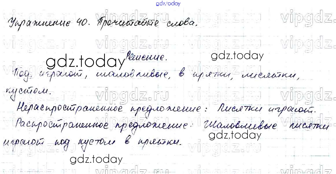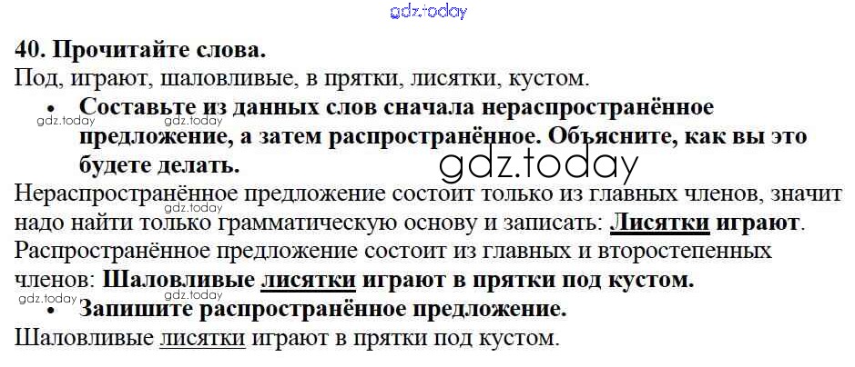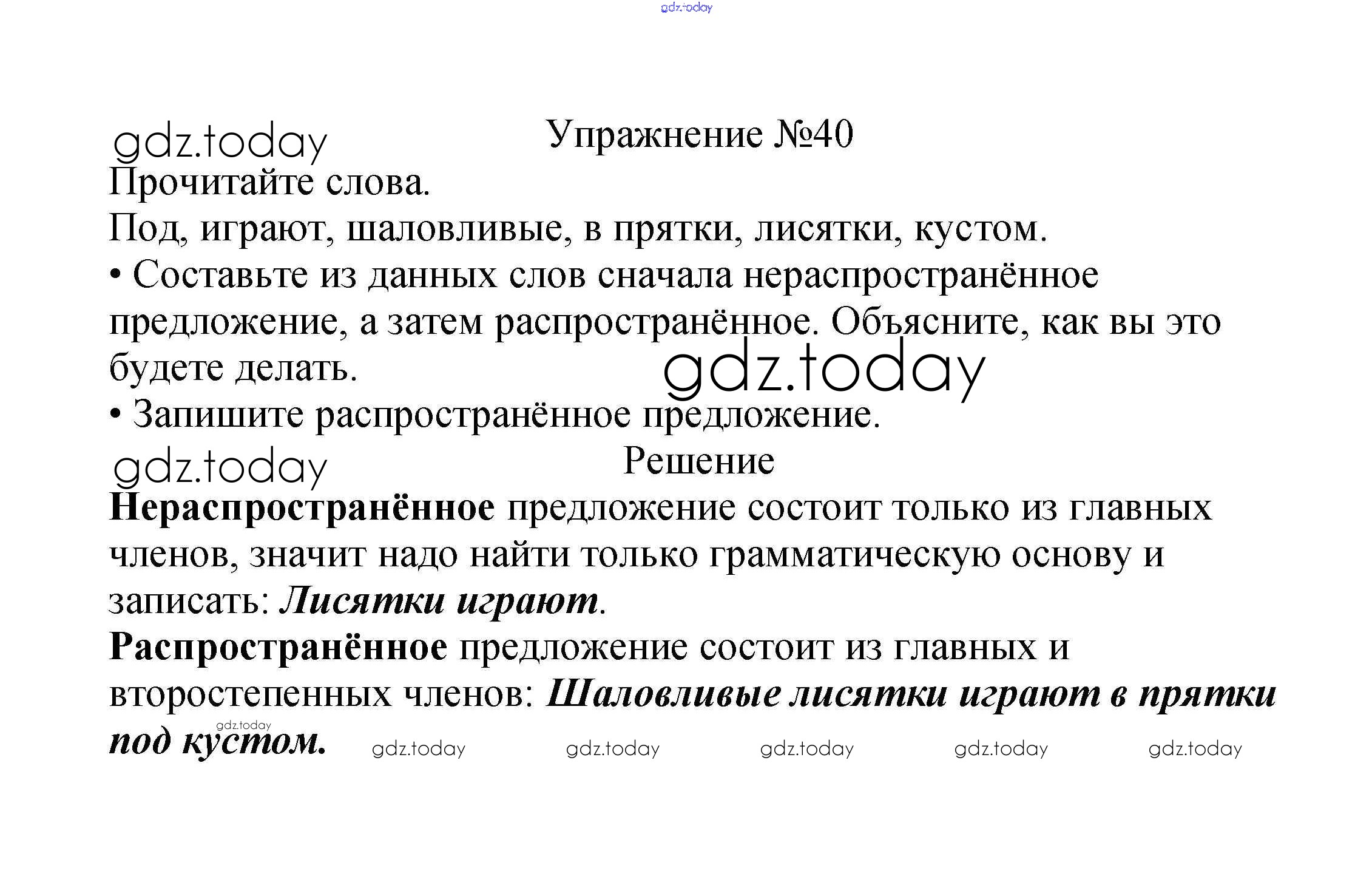 На страницах сайта gdz.today вы найдете учебный и вспомогательный материал, направленный на улучшения знаний школьной программы. ГДЗ - онлайн мир знаний Решение к части №1 (Упражнения) 40 Учебнику по Русскому языку для 2 класса Канакина, Горецкий Просвещение Школа России 2013