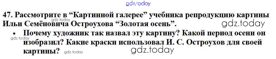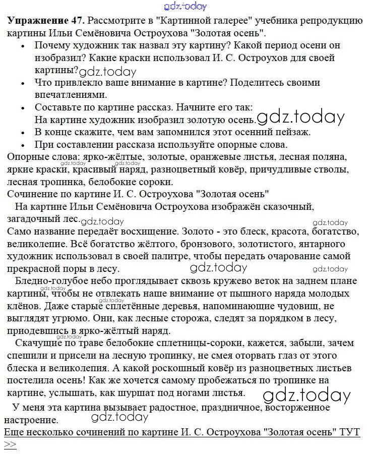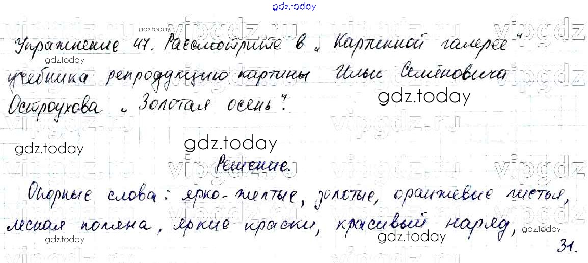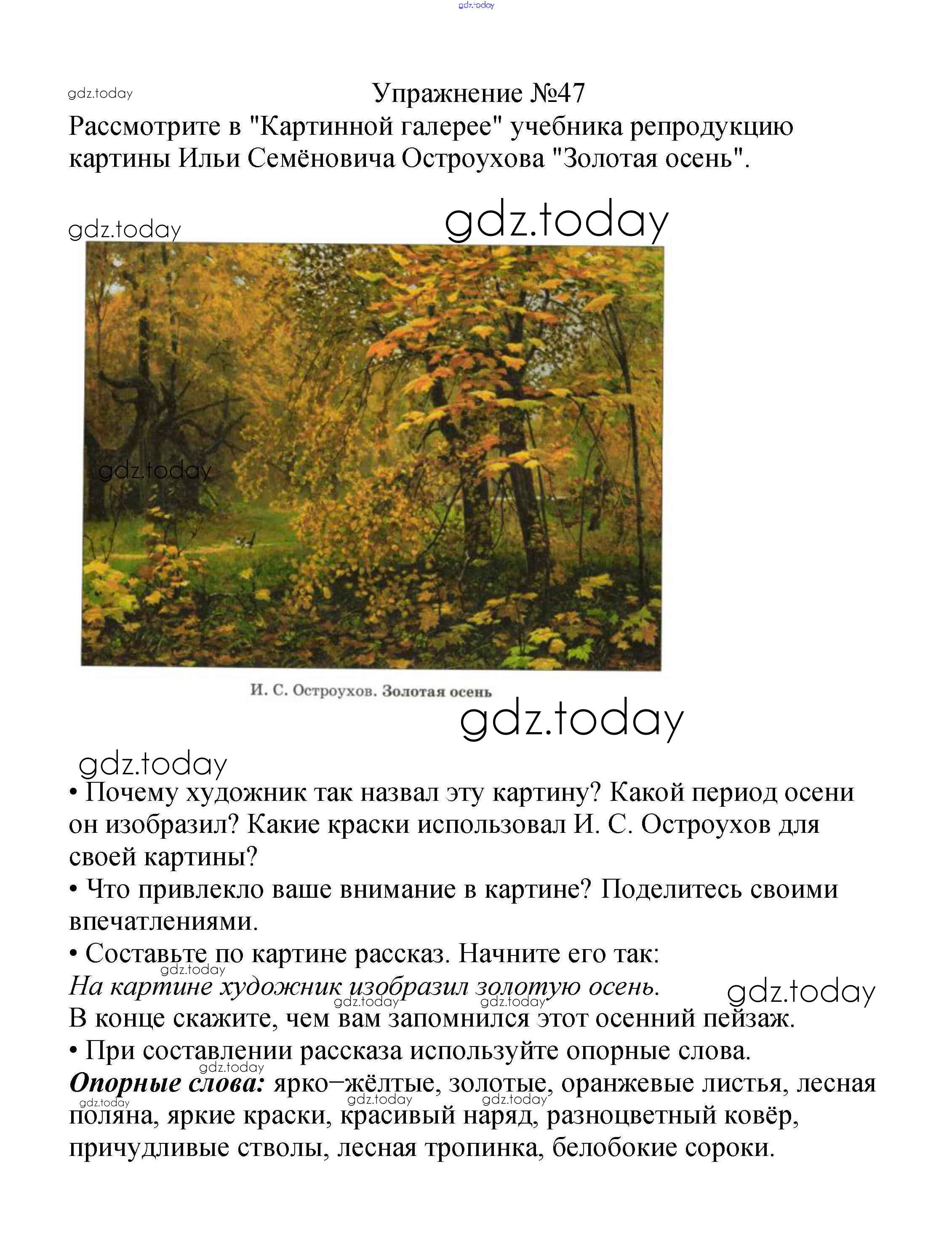 На страницах сайта gdz.today вы найдете учебный и вспомогательный материал, направленный на улучшения знаний школьной программы. ГДЗ - онлайн мир знаний Решение к части №1 (Упражнения) 47 Учебнику по Русскому языку для 2 класса Канакина, Горецкий Просвещение Школа России 2013