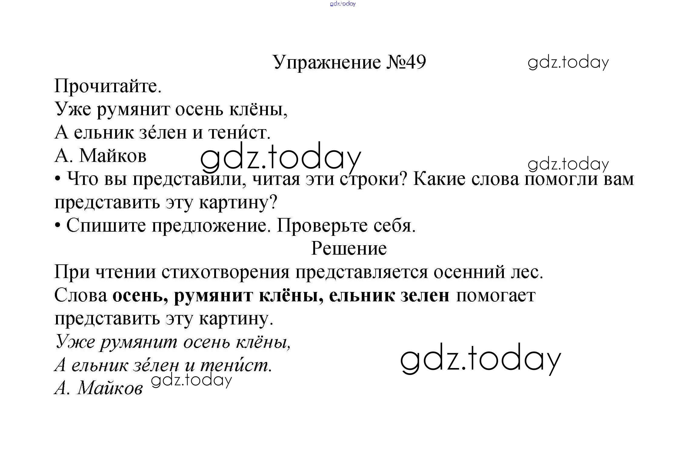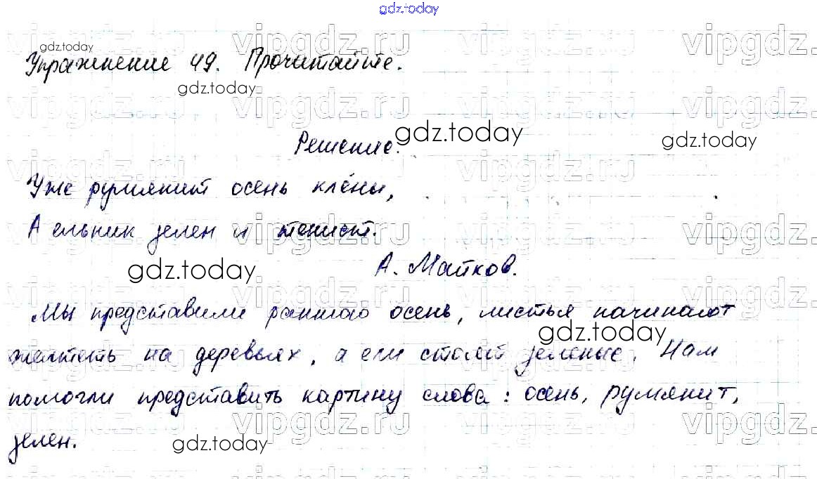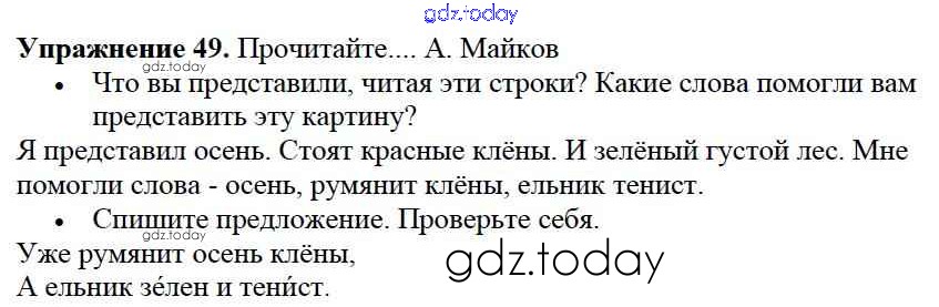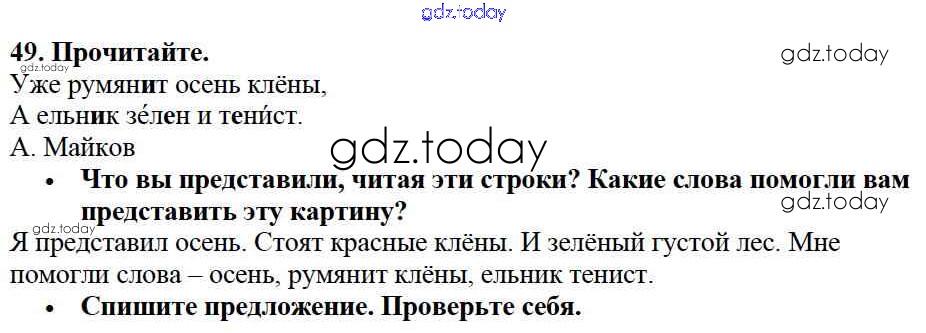На страницах сайта gdz.today вы найдете учебный и вспомогательный материал, направленный на улучшения знаний школьной программы. ГДЗ - онлайн мир знаний Решение к части №1 (Упражнения) 49 Учебнику по Русскому языку для 2 класса Канакина, Горецкий Просвещение Школа России 2013