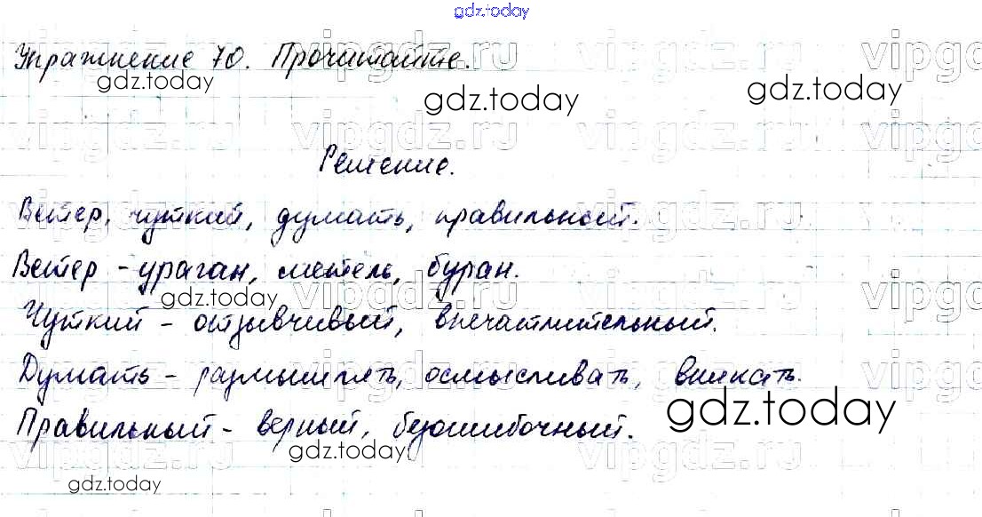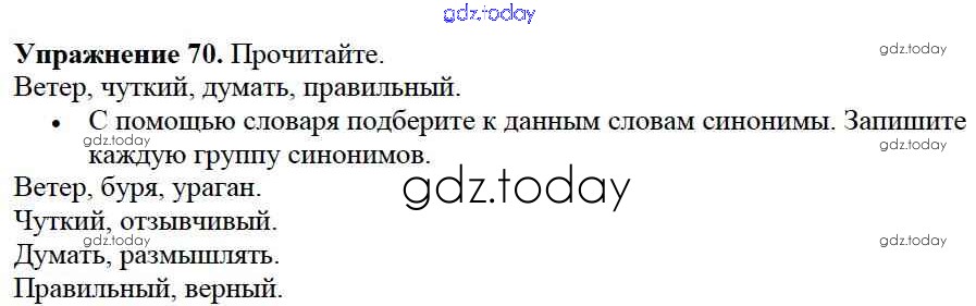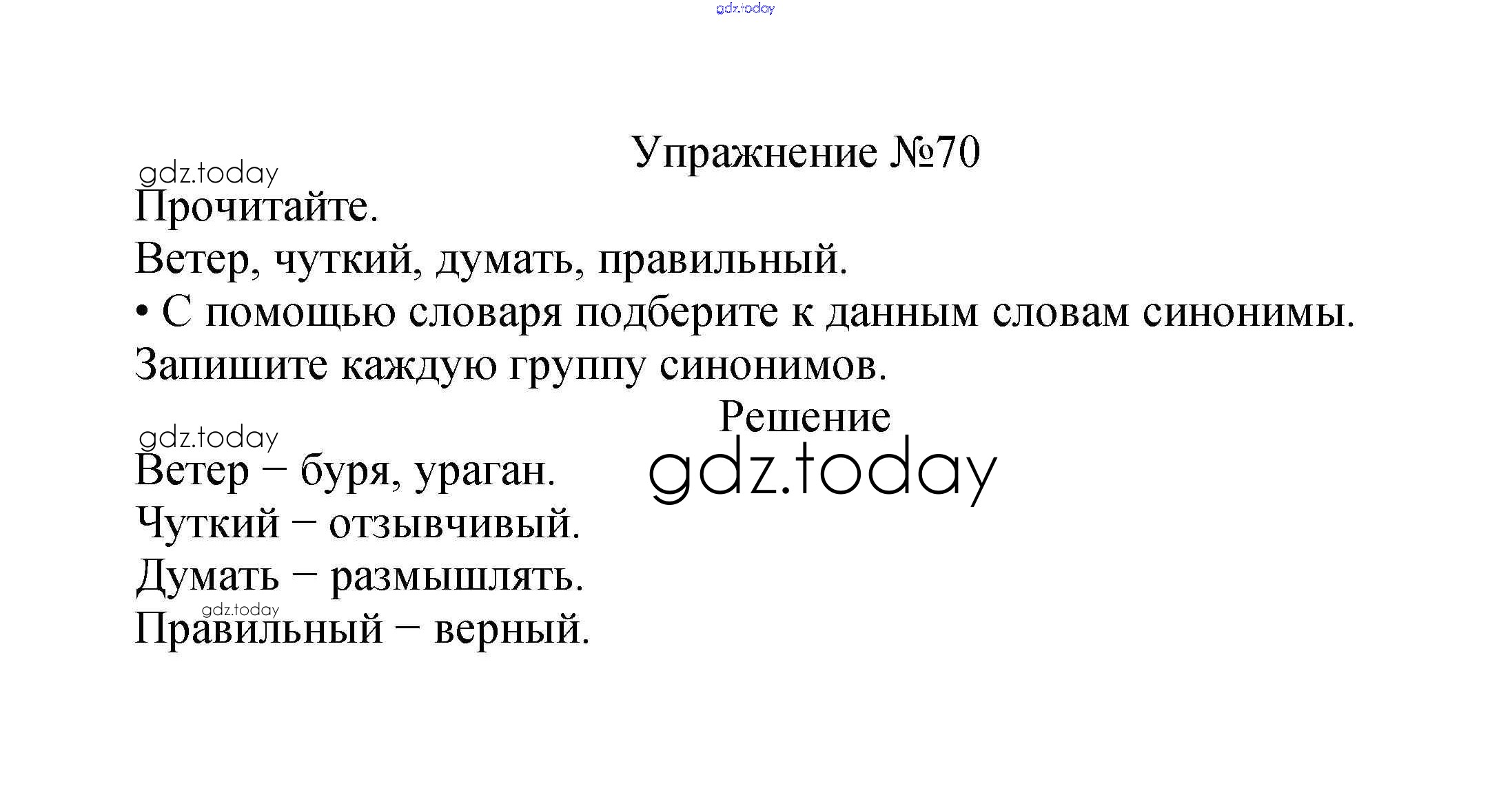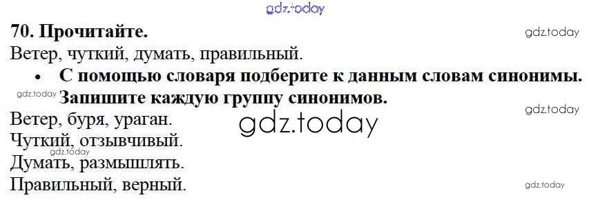 На страницах сайта gdz.today вы найдете учебный и вспомогательный материал, направленный на улучшения знаний школьной программы. ГДЗ - онлайн мир знаний Решение к части №1 (Упражнения) 70 Учебнику по Русскому языку для 2 класса Канакина, Горецкий Просвещение Школа России 2013