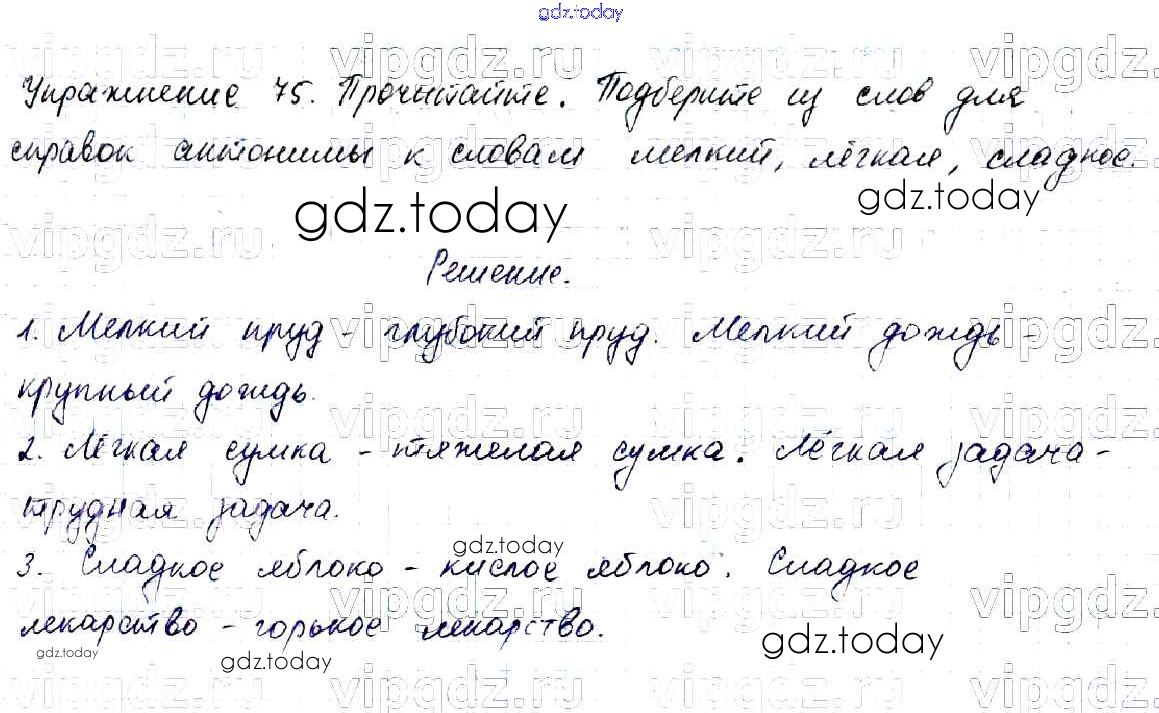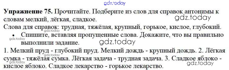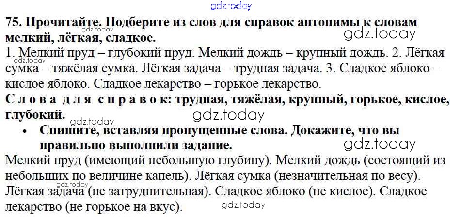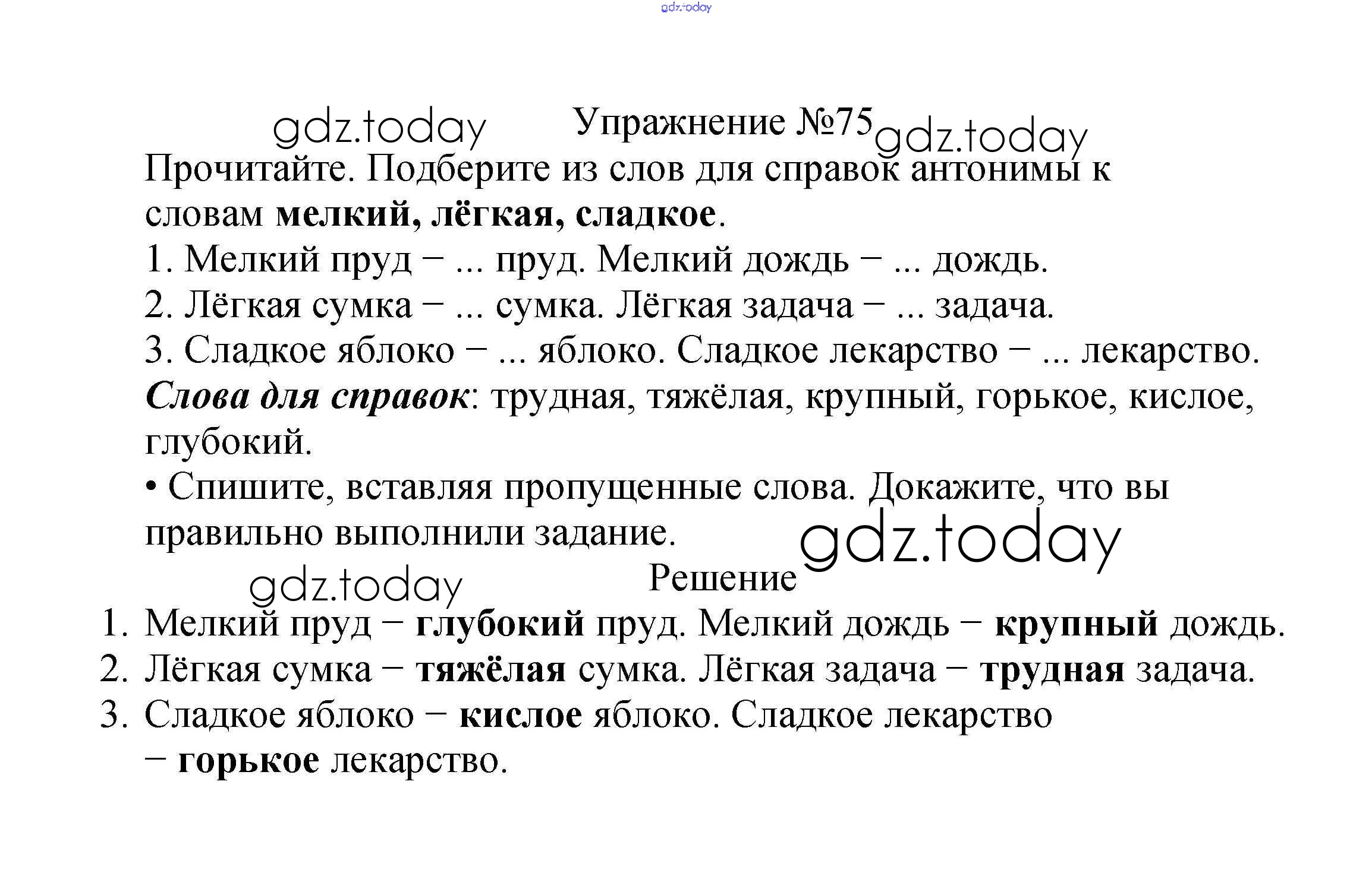 На страницах сайта gdz.today вы найдете учебный и вспомогательный материал, направленный на улучшения знаний школьной программы. ГДЗ - онлайн мир знаний Решение к части №1 (Упражнения) 75 Учебнику по Русскому языку для 2 класса Канакина, Горецкий Просвещение Школа России 2013