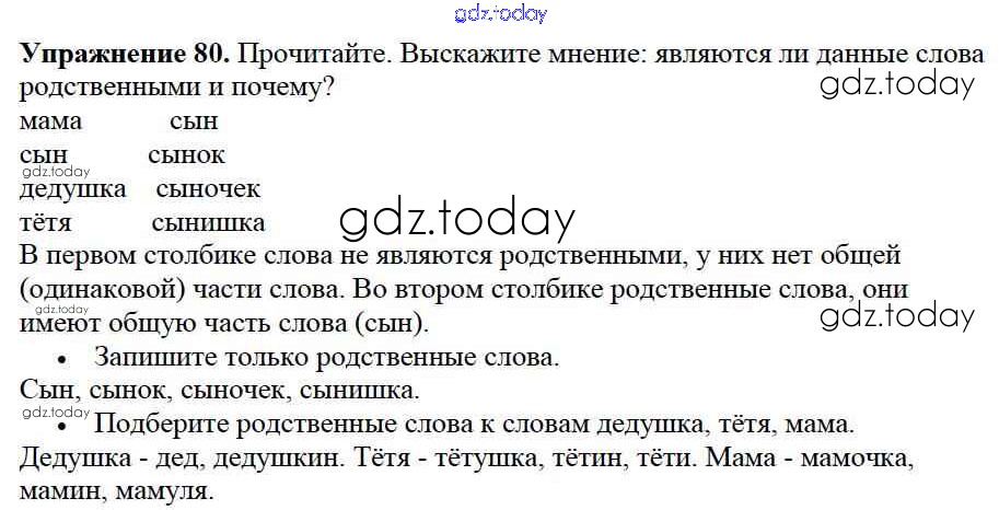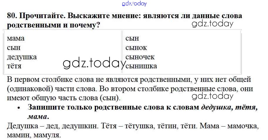 На страницах сайта gdz.today вы найдете учебный и вспомогательный материал, направленный на улучшения знаний школьной программы. ГДЗ - онлайн мир знаний Решение к части №1 (Упражнения) 80 Учебнику по Русскому языку для 2 класса Канакина, Горецкий Просвещение Школа России 2013