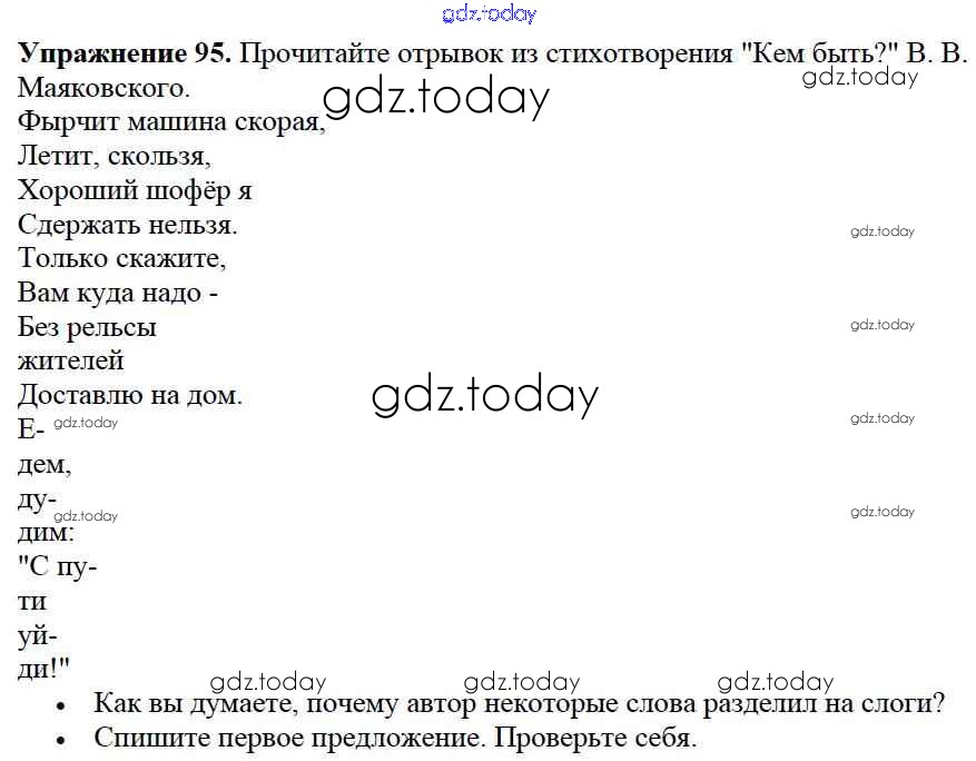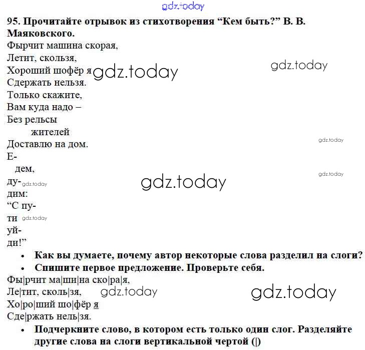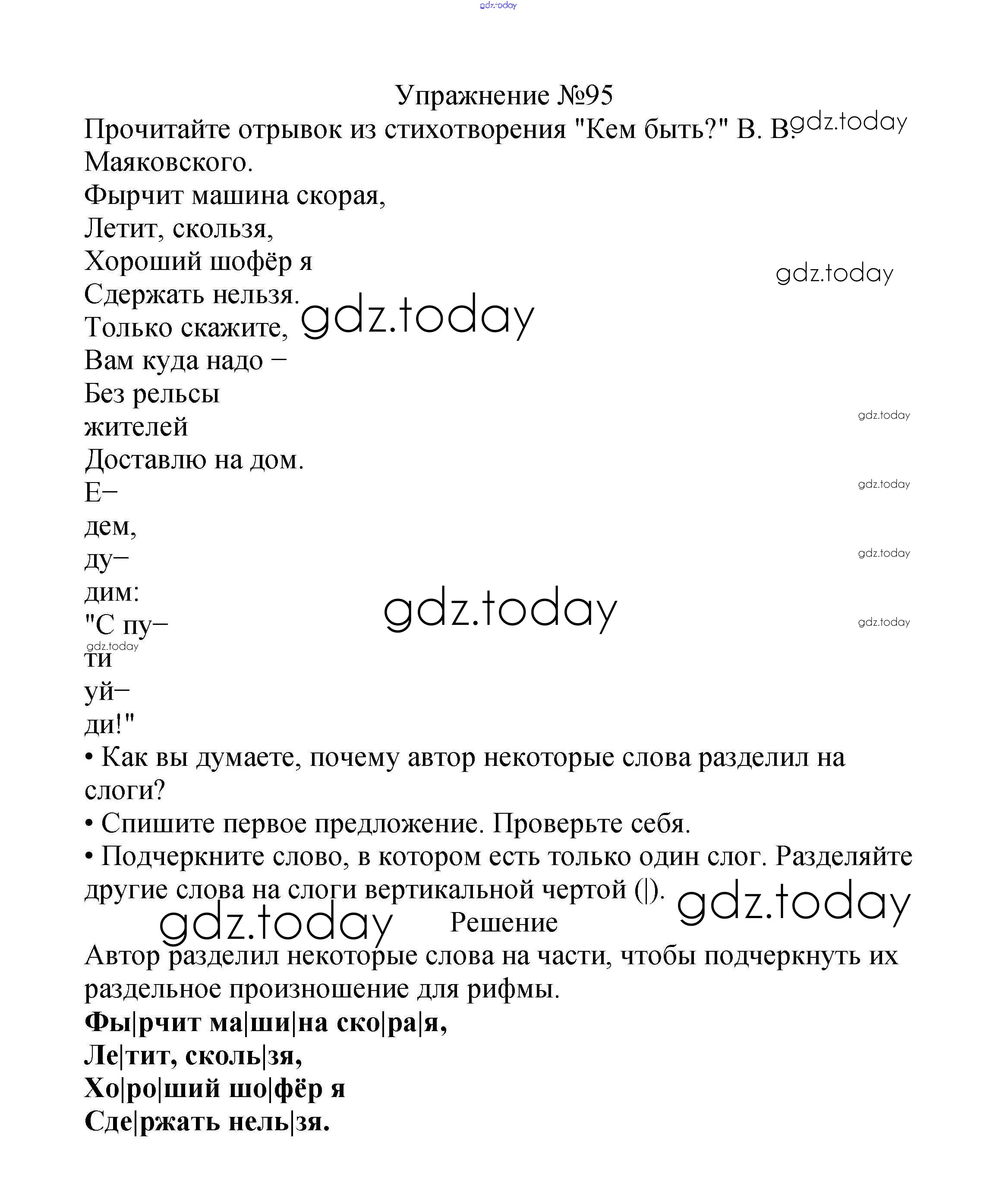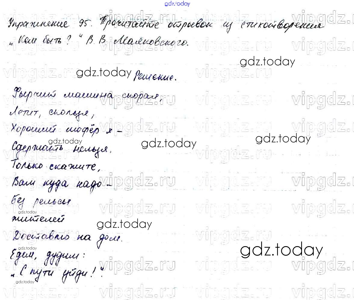 На страницах сайта gdz.today вы найдете учебный и вспомогательный материал, направленный на улучшения знаний школьной программы. ГДЗ - онлайн мир знаний Решение к части №1 (Упражнения) 95 Учебнику по Русскому языку для 2 класса Канакина, Горецкий Просвещение Школа России 2013