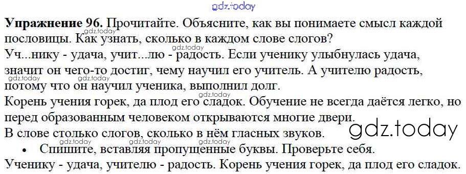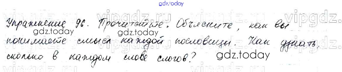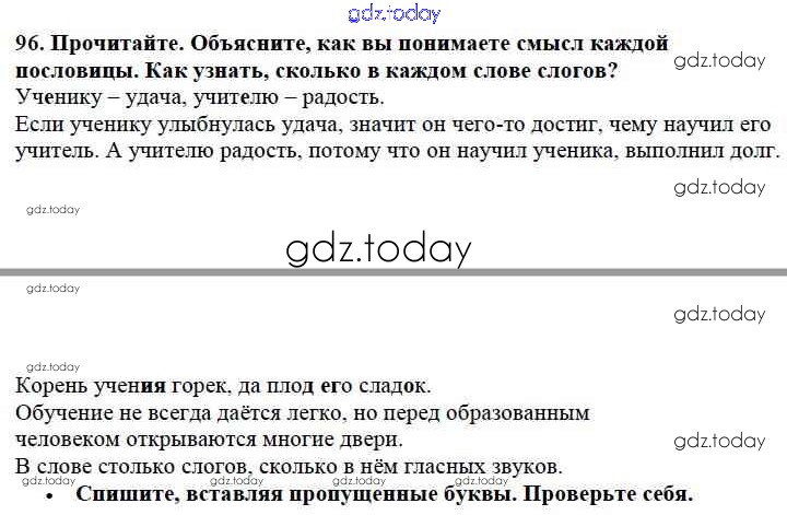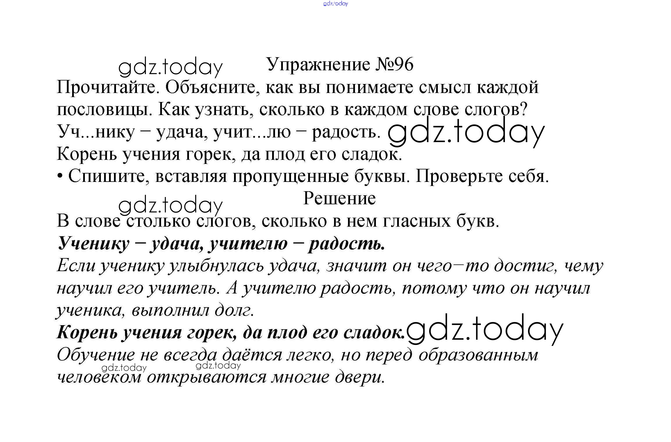 На страницах сайта gdz.today вы найдете учебный и вспомогательный материал, направленный на улучшения знаний школьной программы. ГДЗ - онлайн мир знаний Решение к части №1 (Упражнения) 96 Учебнику по Русскому языку для 2 класса Канакина, Горецкий Просвещение Школа России 2013