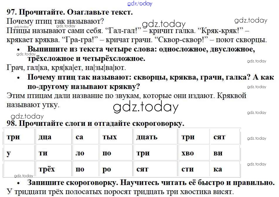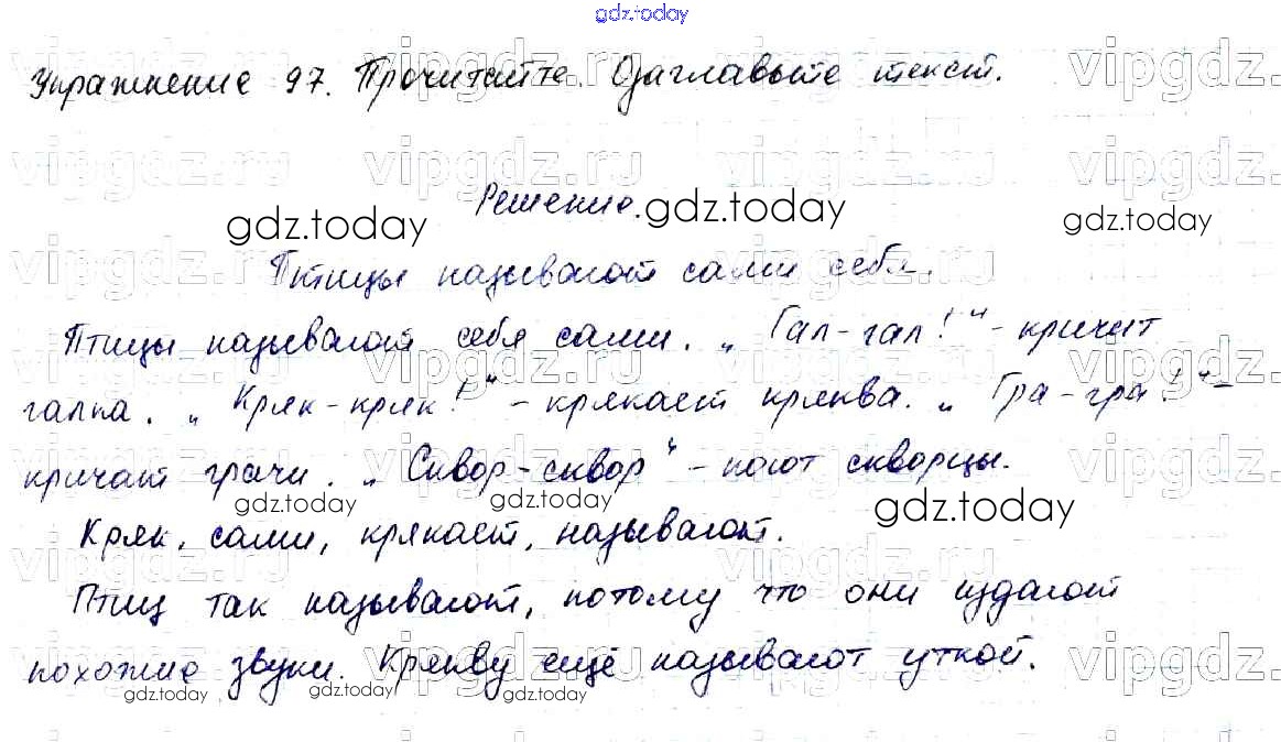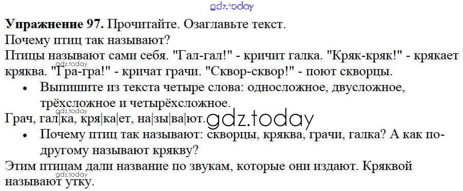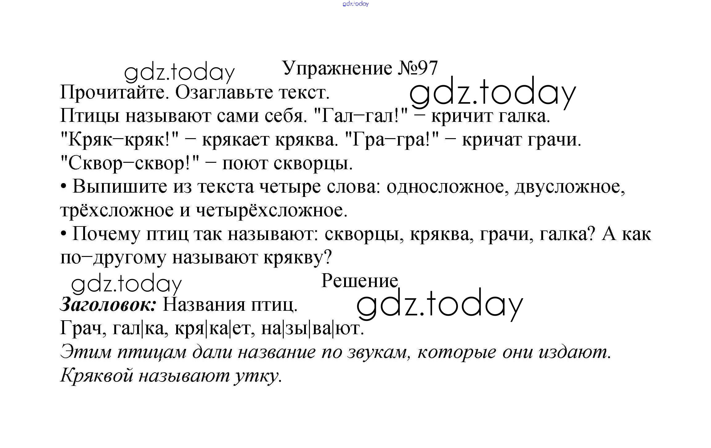 На страницах сайта gdz.today вы найдете учебный и вспомогательный материал, направленный на улучшения знаний школьной программы. ГДЗ - онлайн мир знаний Решение к части №1 (Упражнения) 97 Учебнику по Русскому языку для 2 класса Канакина, Горецкий Просвещение Школа России 2013