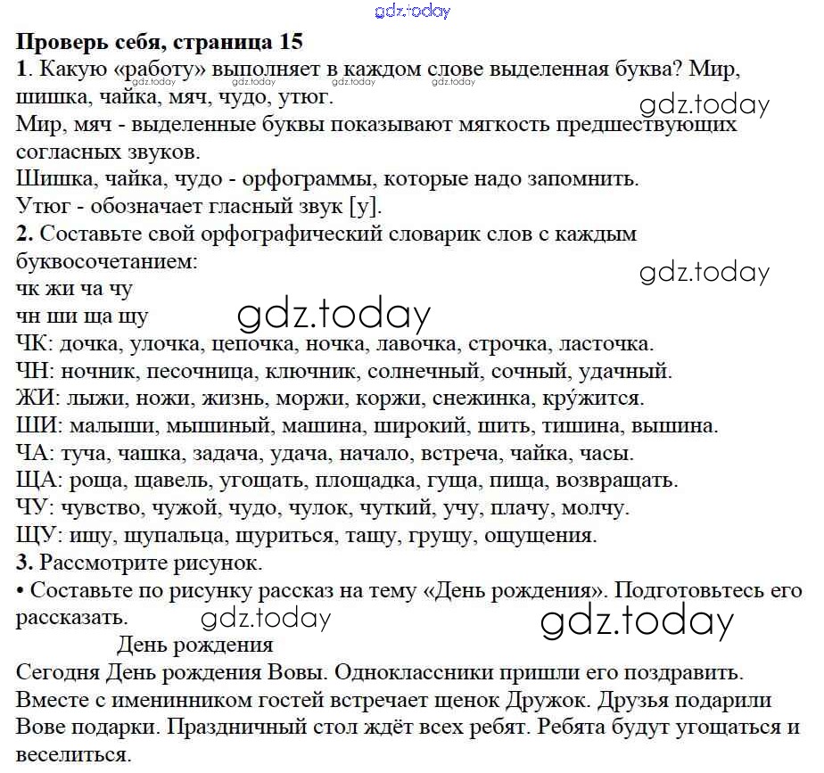 На страницах сайта gdz.today вы найдете учебный и вспомогательный материал, направленный на улучшения знаний школьной программы. ГДЗ - онлайн мир знаний Проверь себя Решение к части №2 (Упражнения) стр. 15 Учебнику по Русскому языку для 2 класса Канакина, Горецкий Просвещение Школа России 2013
