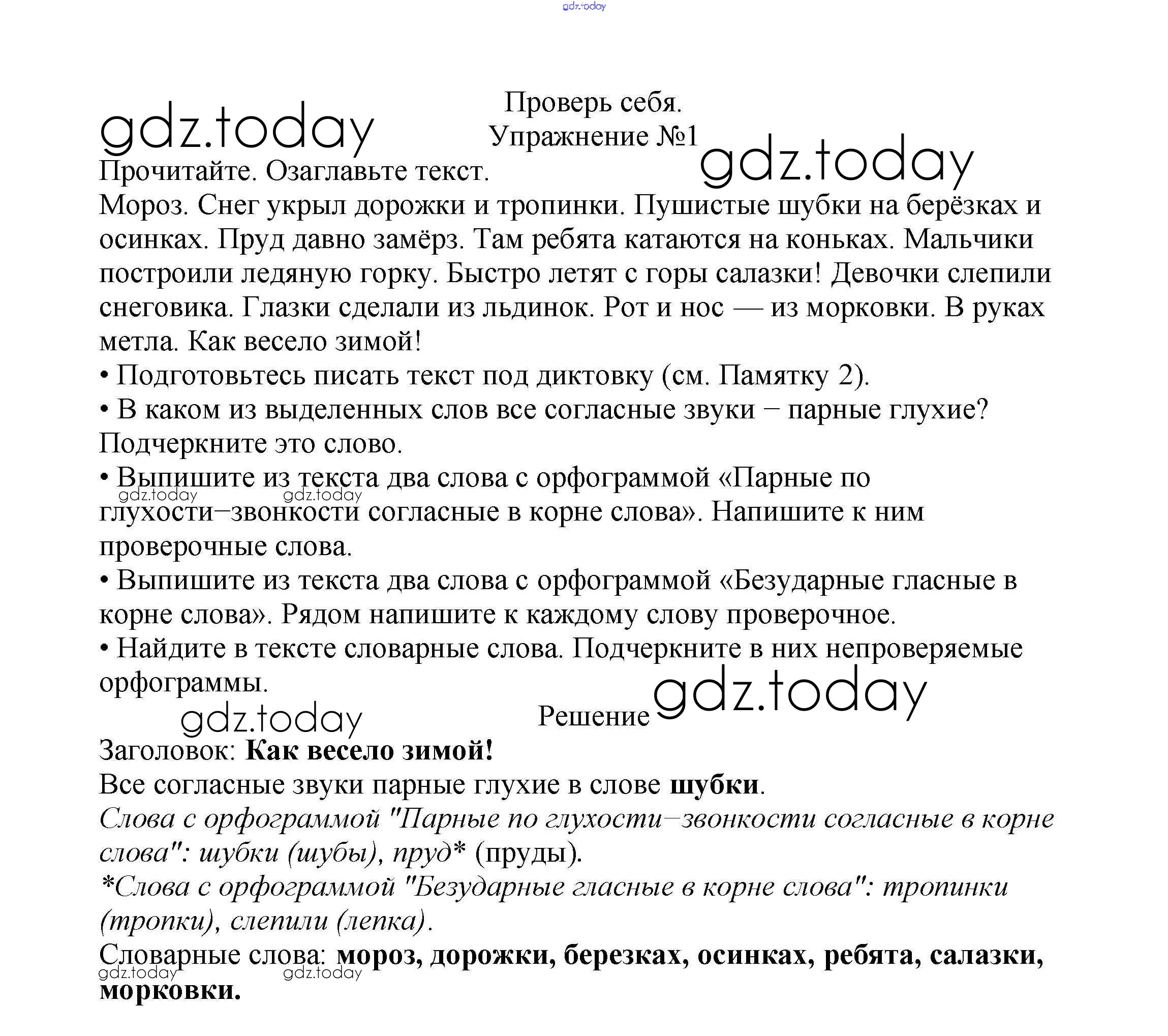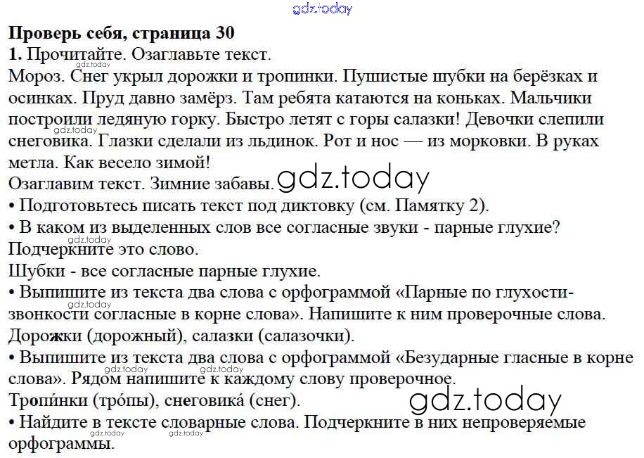 На страницах сайта gdz.today вы найдете учебный и вспомогательный материал, направленный на улучшения знаний школьной программы. ГДЗ - онлайн мир знаний Проверь себя Решение к части №2 (Упражнения) стр. 30 Учебнику по Русскому языку для 2 класса Канакина, Горецкий Просвещение Школа России 2013