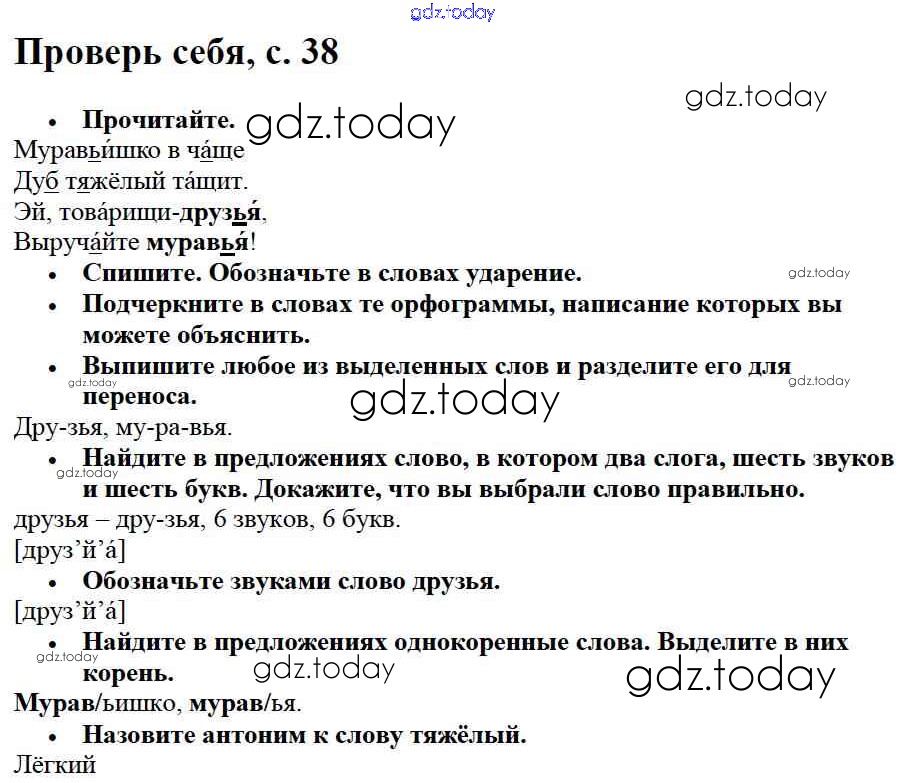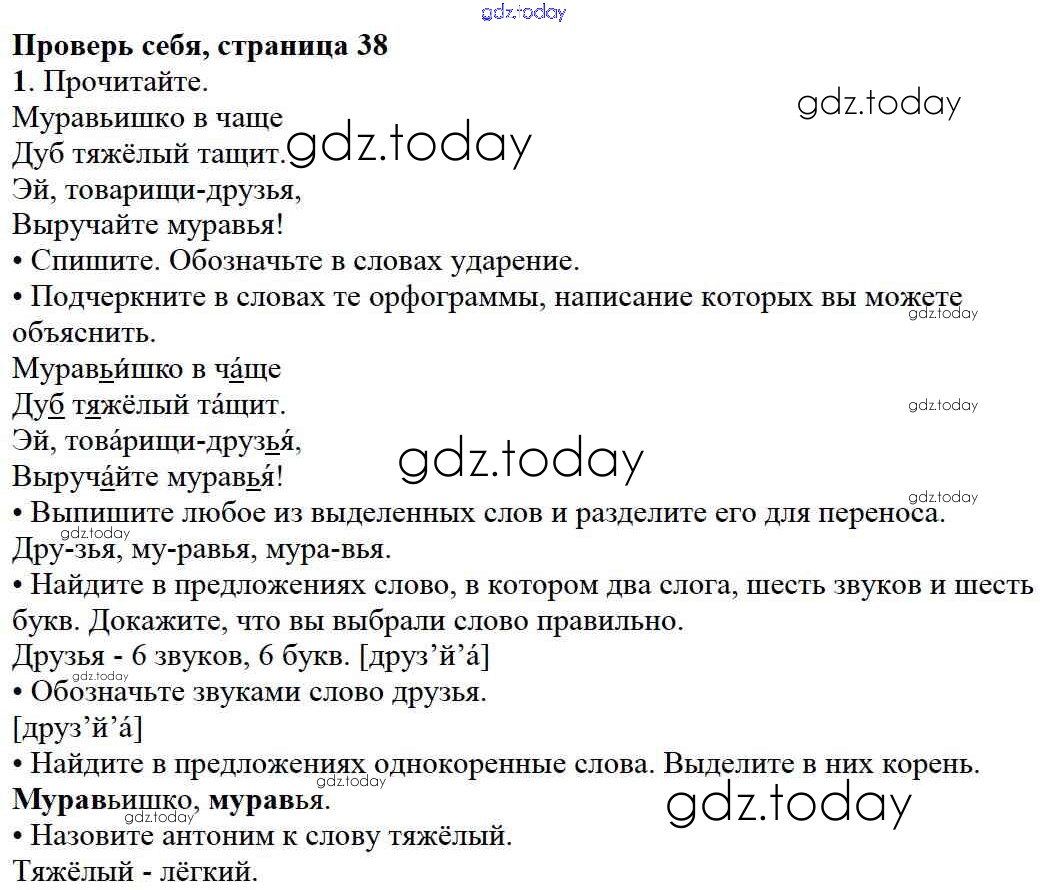На страницах сайта gdz.today вы найдете учебный и вспомогательный материал, направленный на улучшения знаний школьной программы. ГДЗ - онлайн мир знаний Проверь себя Решение к части №2 (Упражнения) стр. 38 Учебнику по Русскому языку для 2 класса Канакина, Горецкий Просвещение Школа России 2013