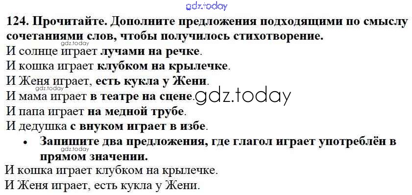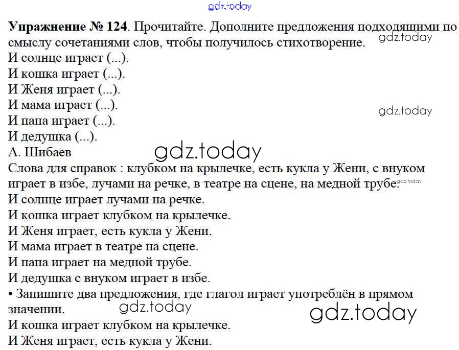 На страницах сайта gdz.today вы найдете учебный и вспомогательный материал, направленный на улучшения знаний школьной программы. ГДЗ - онлайн мир знаний Решение к части №2 (Упражнения) 124 Учебнику по Русскому языку для 2 класса Канакина, Горецкий Просвещение Школа России 2013