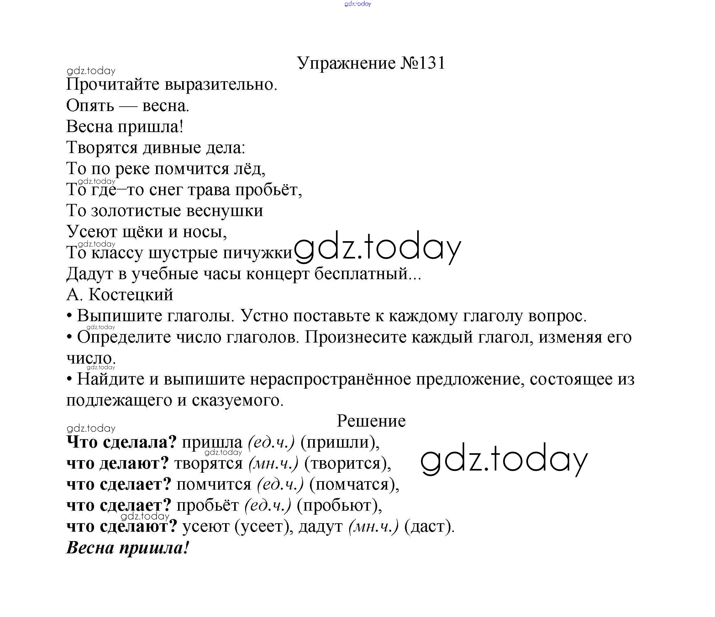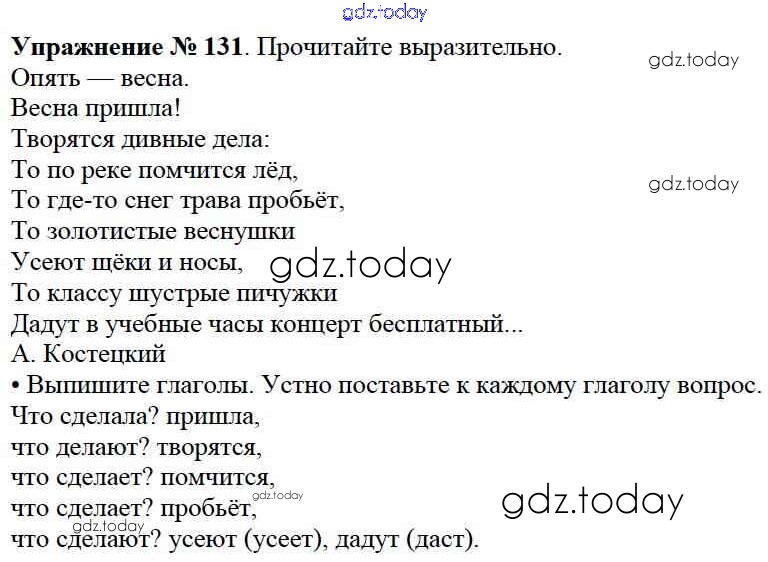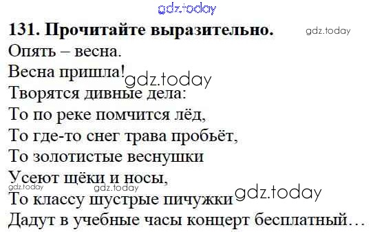 На страницах сайта gdz.today вы найдете учебный и вспомогательный материал, направленный на улучшения знаний школьной программы. ГДЗ - онлайн мир знаний Решение к части №2 (Упражнения) 131 Учебнику по Русскому языку для 2 класса Канакина, Горецкий Просвещение Школа России 2013