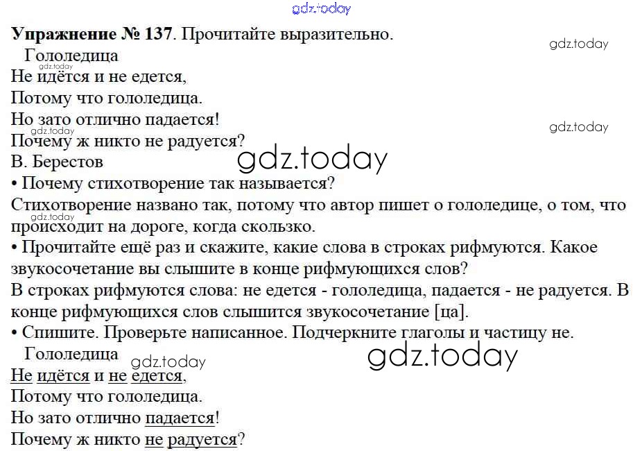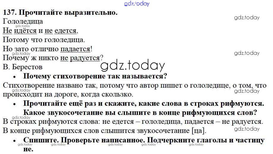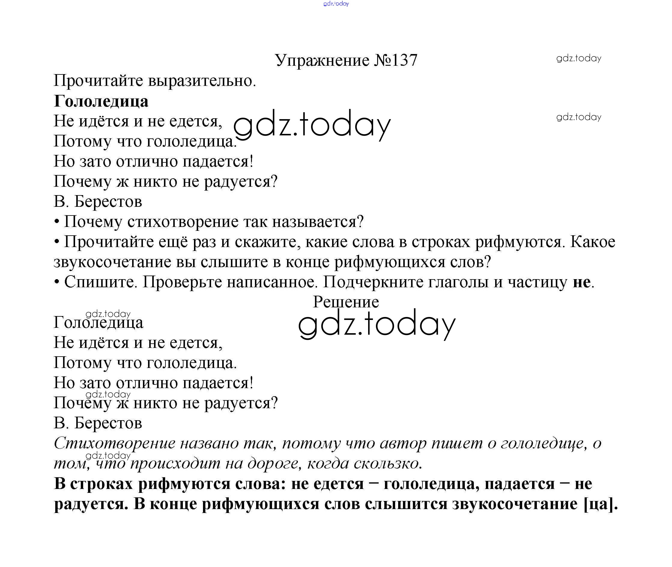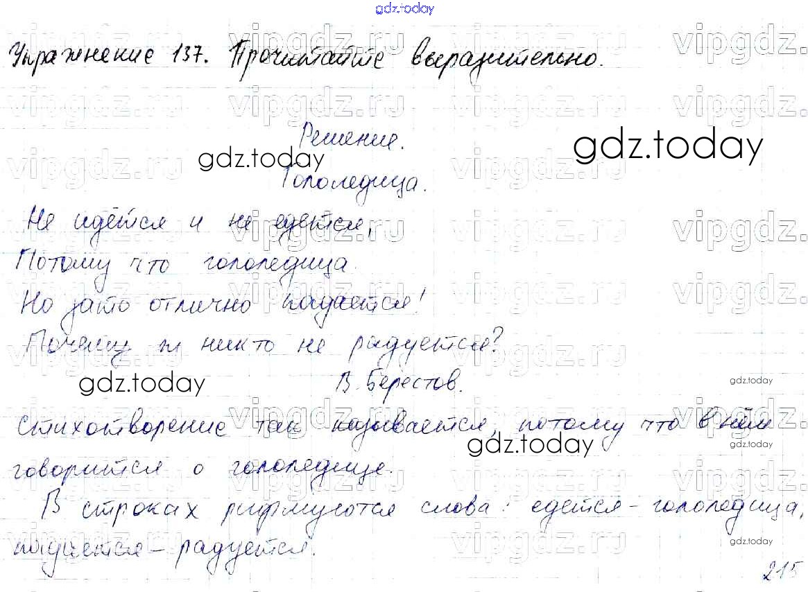На страницах сайта gdz.today вы найдете учебный и вспомогательный материал, направленный на улучшения знаний школьной программы. ГДЗ - онлайн мир знаний Решение к части №2 (Упражнения) 137 Учебнику по Русскому языку для 2 класса Канакина, Горецкий Просвещение Школа России 2013
