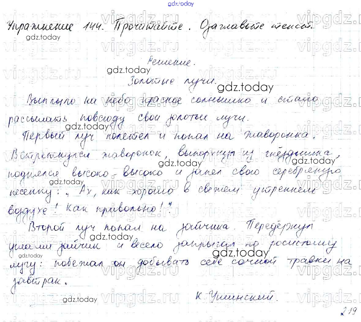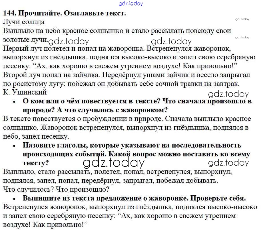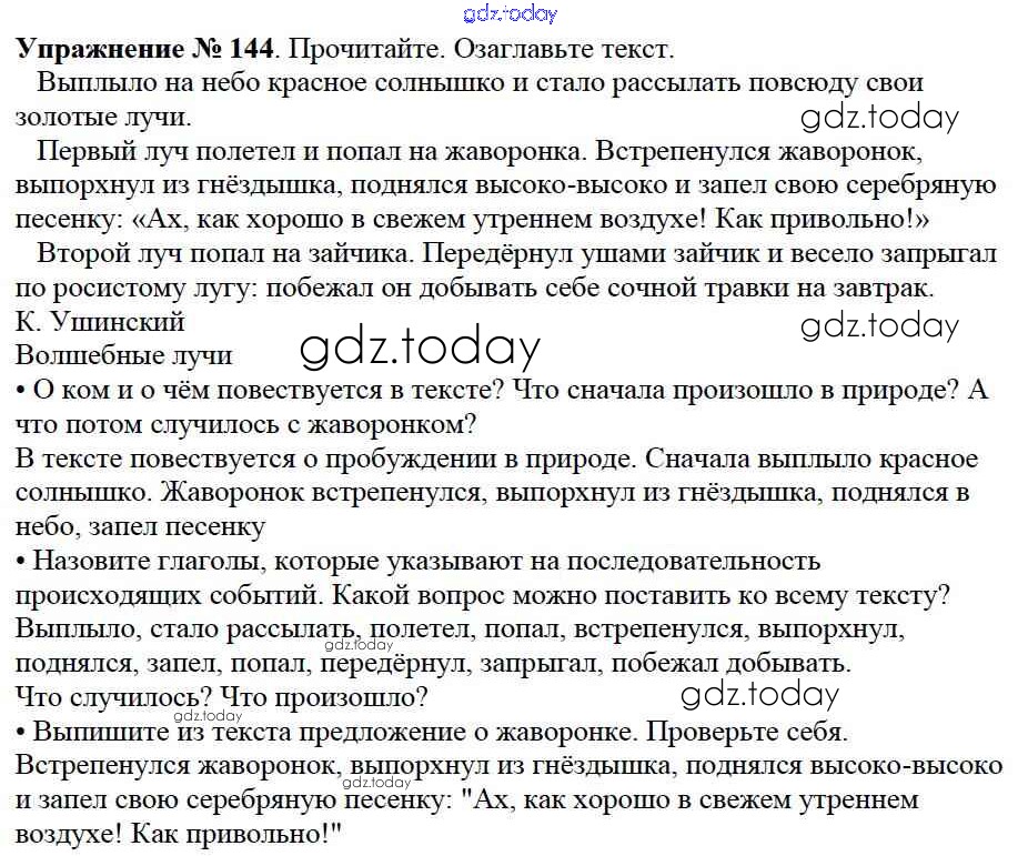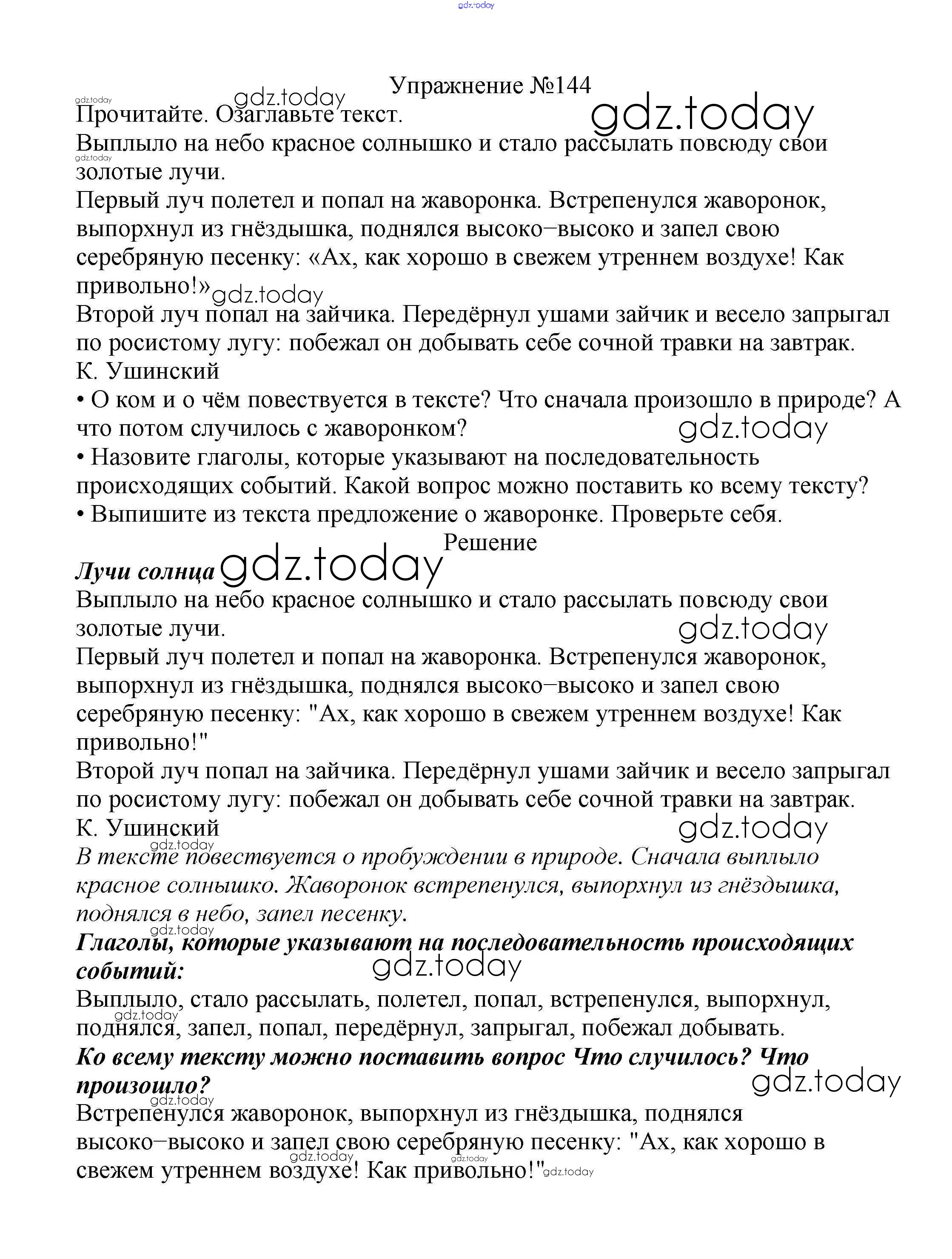 На страницах сайта gdz.today вы найдете учебный и вспомогательный материал, направленный на улучшения знаний школьной программы. ГДЗ - онлайн мир знаний Решение к части №2 (Упражнения) 144 Учебнику по Русскому языку для 2 класса Канакина, Горецкий Просвещение Школа России 2013
