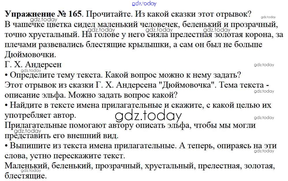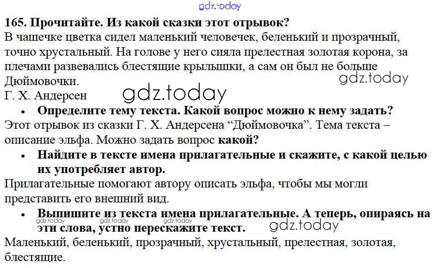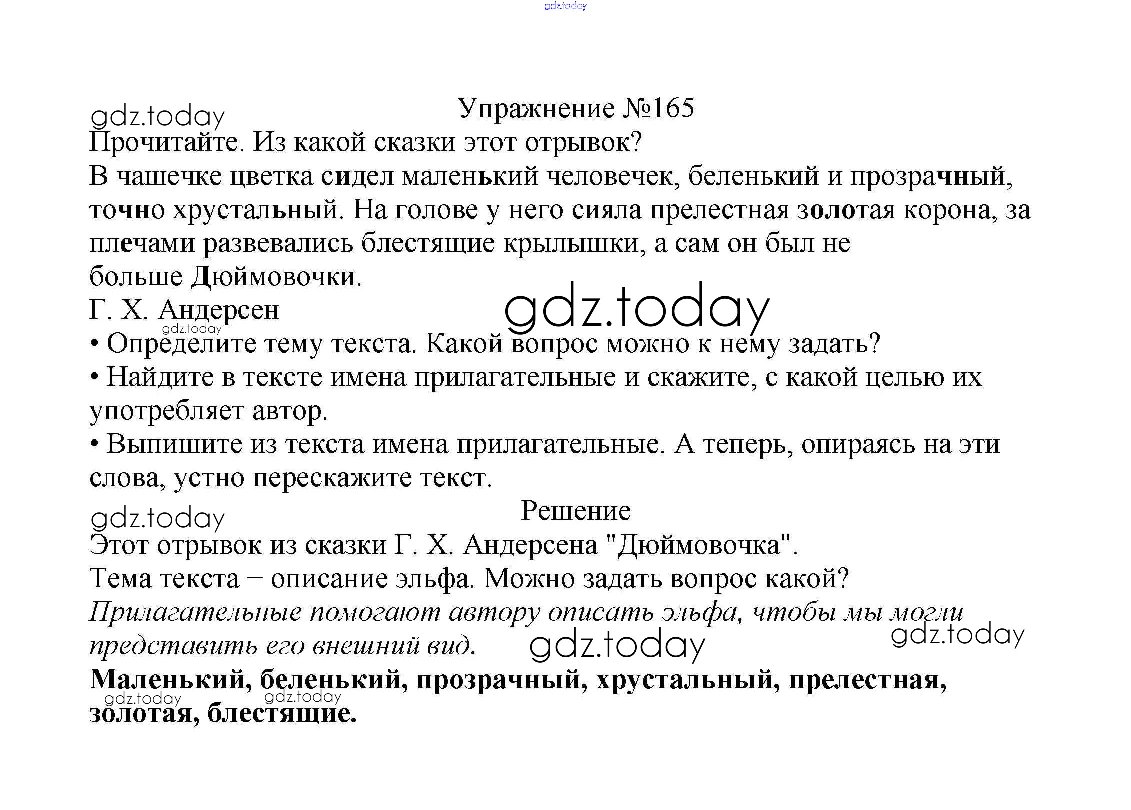 На страницах сайта gdz.today вы найдете учебный и вспомогательный материал, направленный на улучшения знаний школьной программы. ГДЗ - онлайн мир знаний Решение к части №2 (Упражнения) 165 Учебнику по Русскому языку для 2 класса Канакина, Горецкий Просвещение Школа России 2013
