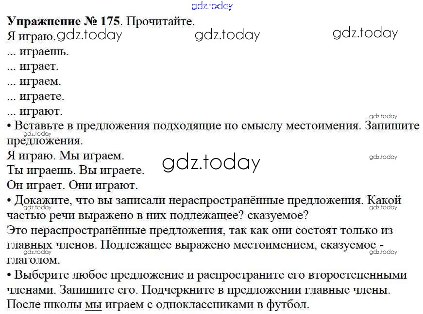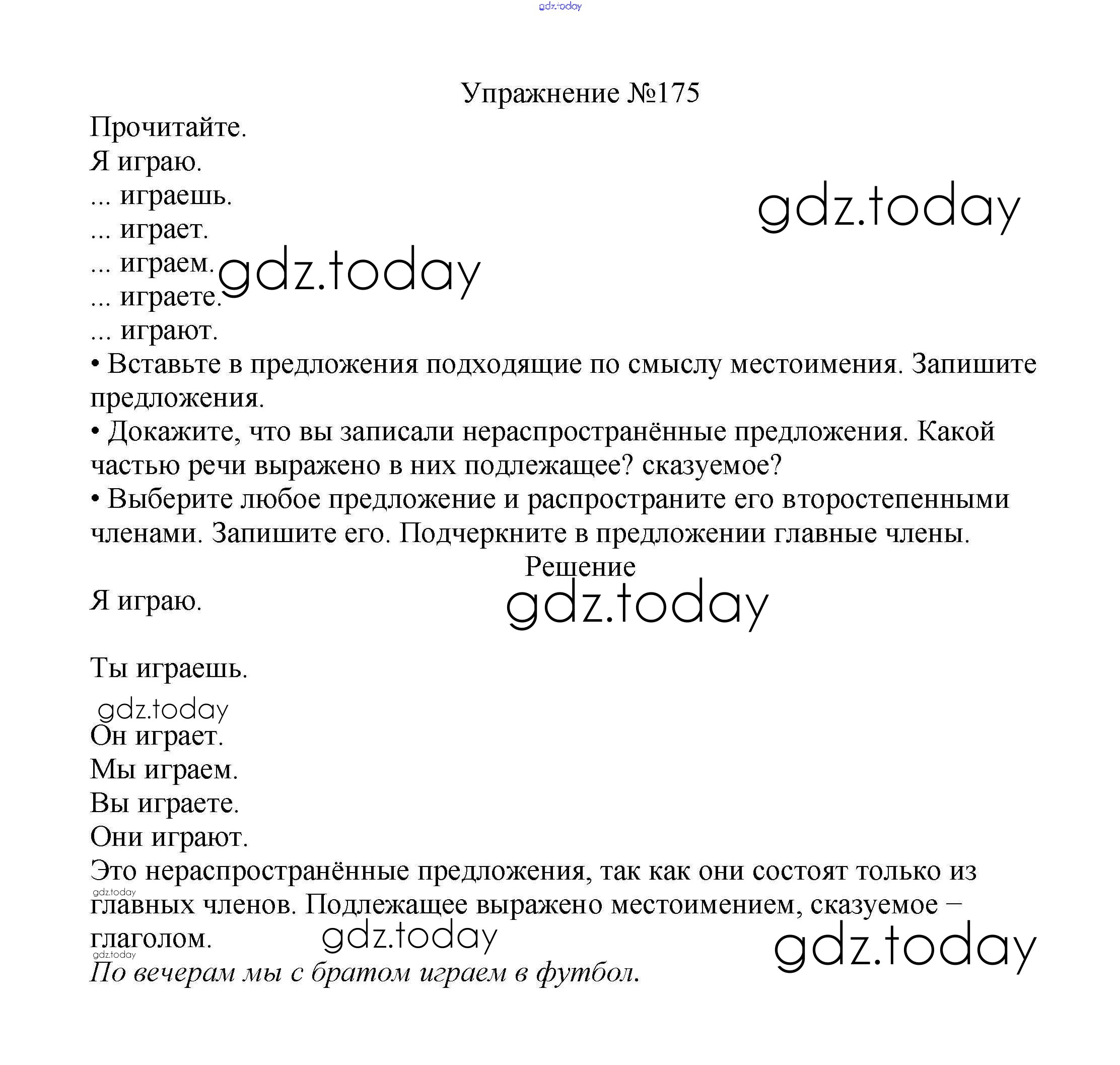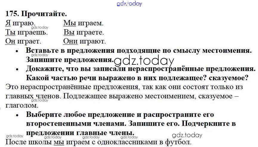 На страницах сайта gdz.today вы найдете учебный и вспомогательный материал, направленный на улучшения знаний школьной программы. ГДЗ - онлайн мир знаний Решение к части №2 (Упражнения) 175 Учебнику по Русскому языку для 2 класса Канакина, Горецкий Просвещение Школа России 2013