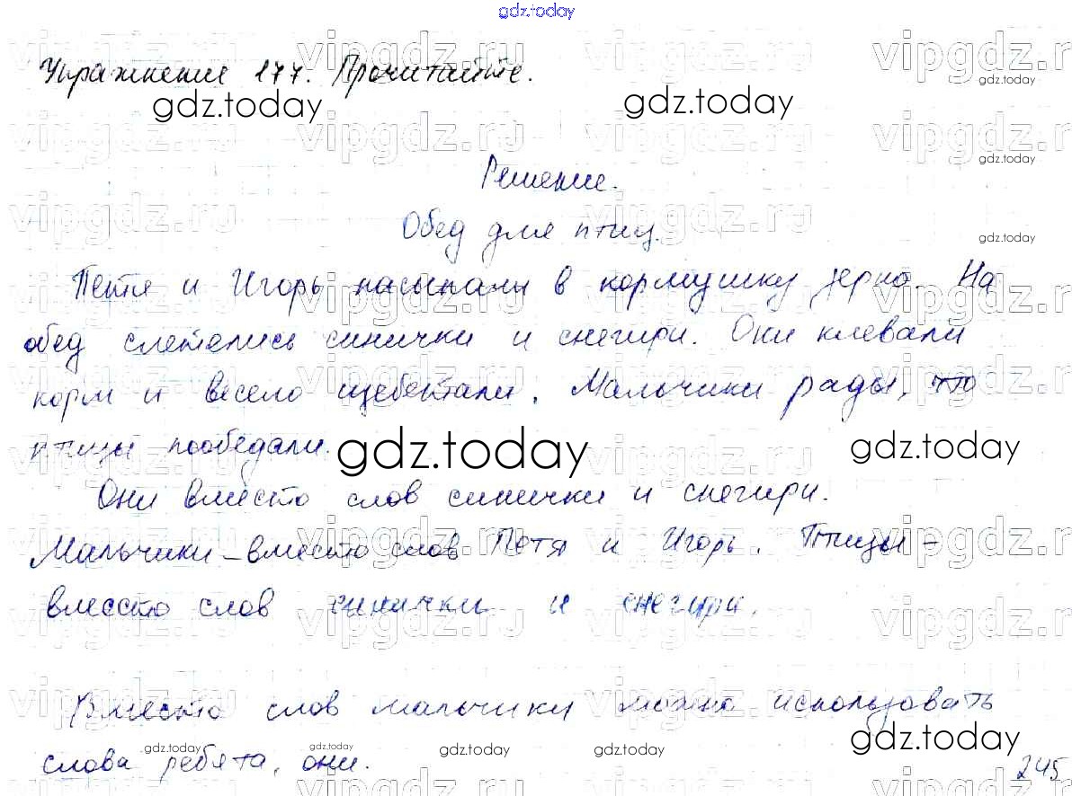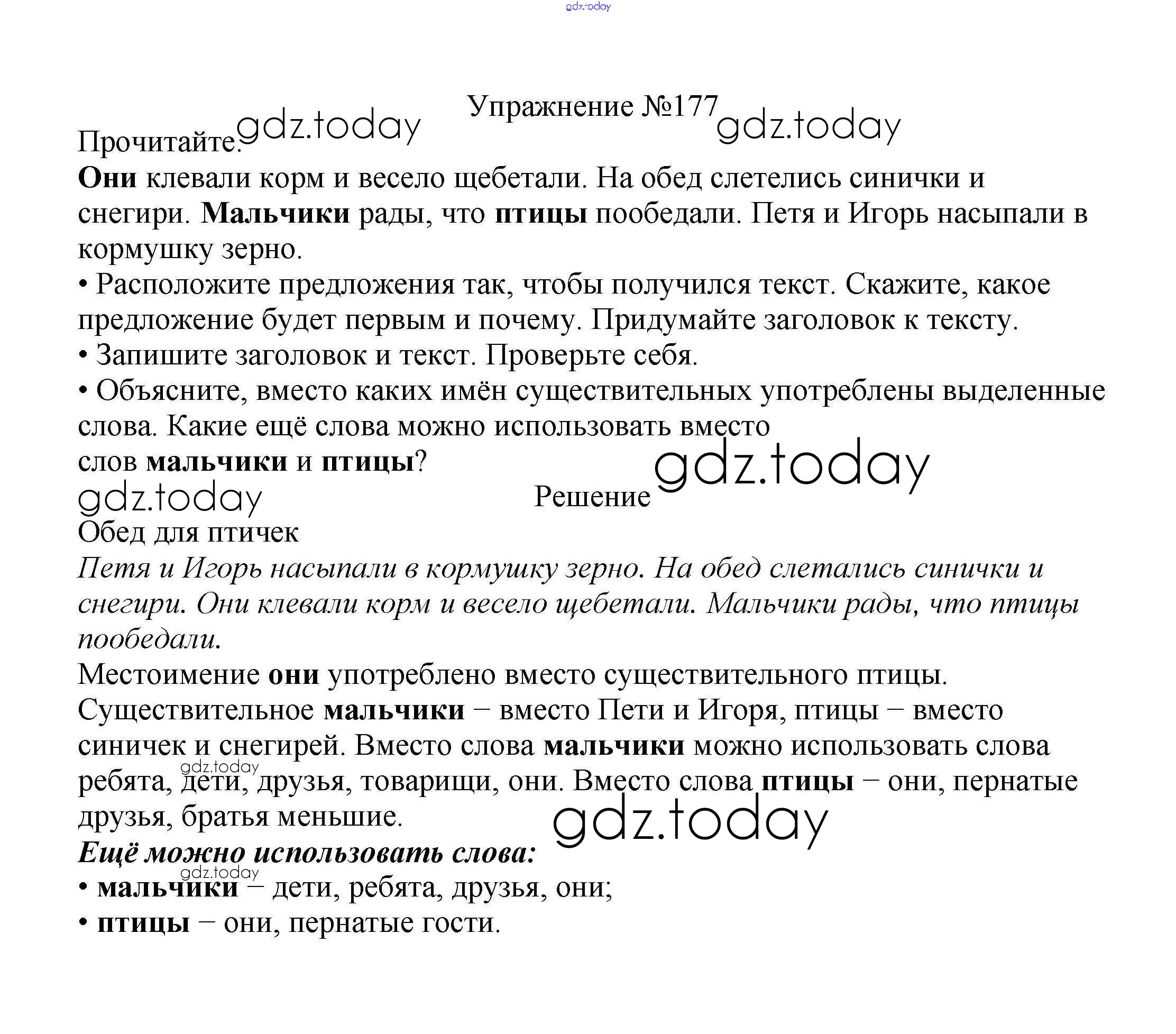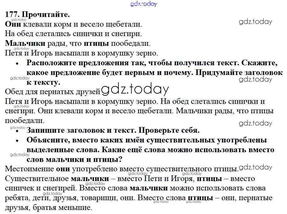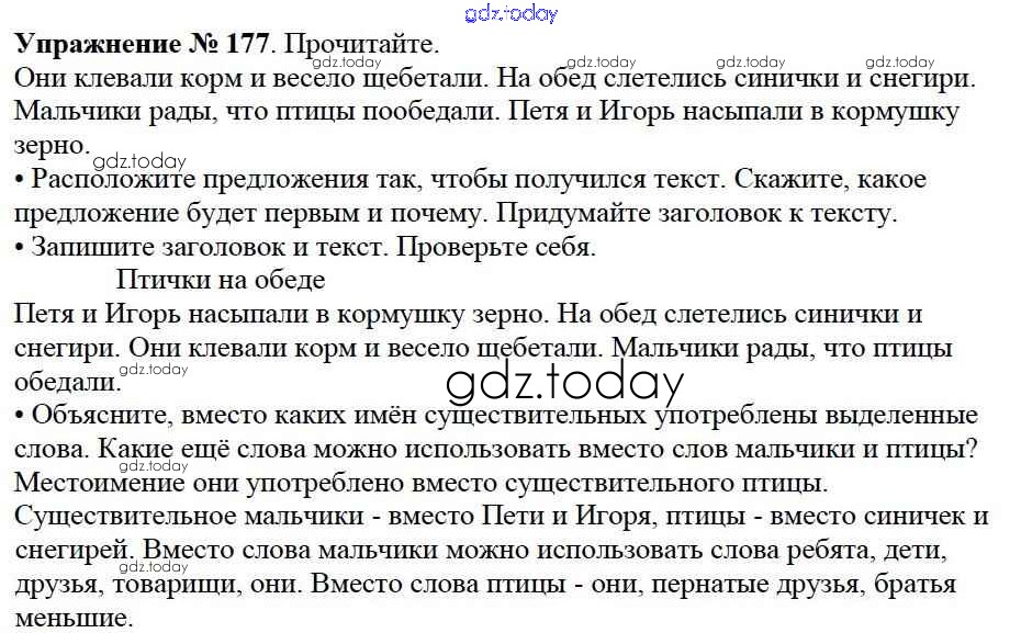 На страницах сайта gdz.today вы найдете учебный и вспомогательный материал, направленный на улучшения знаний школьной программы. ГДЗ - онлайн мир знаний Решение к части №2 (Упражнения) 177 Учебнику по Русскому языку для 2 класса Канакина, Горецкий Просвещение Школа России 2013