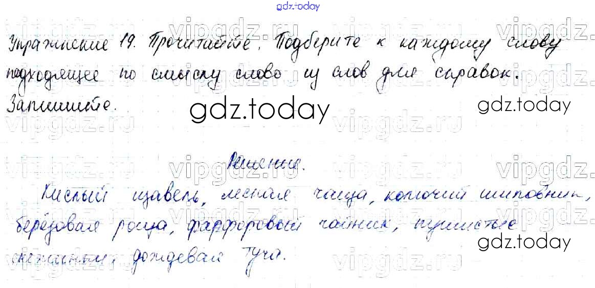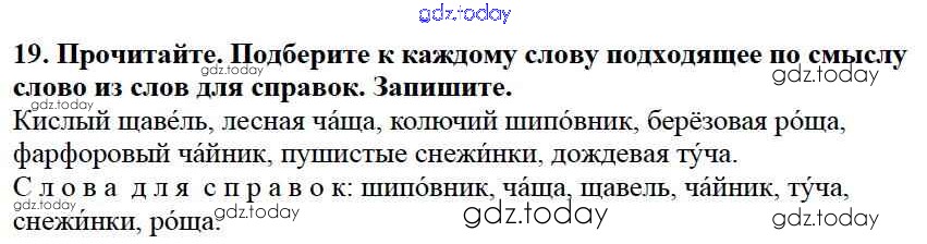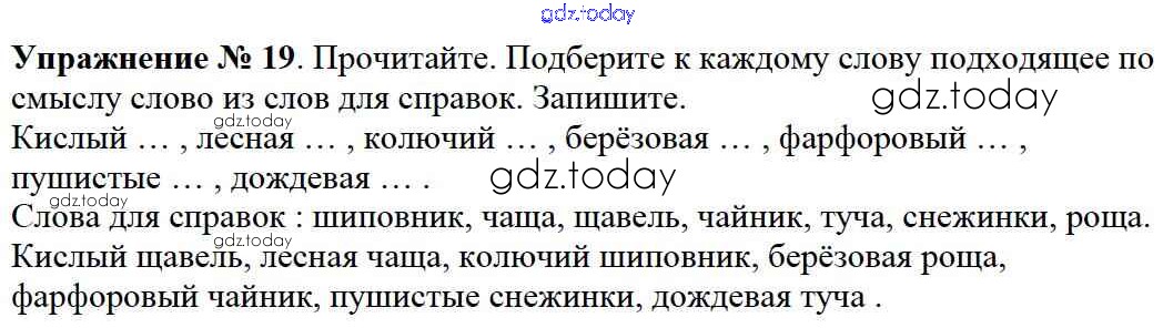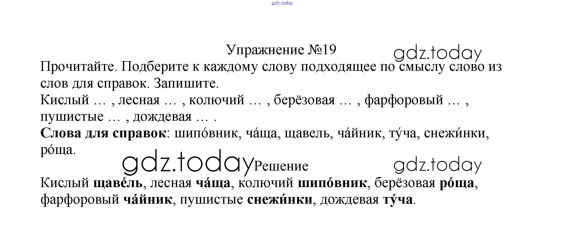 На страницах сайта gdz.today вы найдете учебный и вспомогательный материал, направленный на улучшения знаний школьной программы. ГДЗ - онлайн мир знаний Решение к части №2 (Упражнения) 19 Учебнику по Русскому языку для 2 класса Канакина, Горецкий Просвещение Школа России 2013